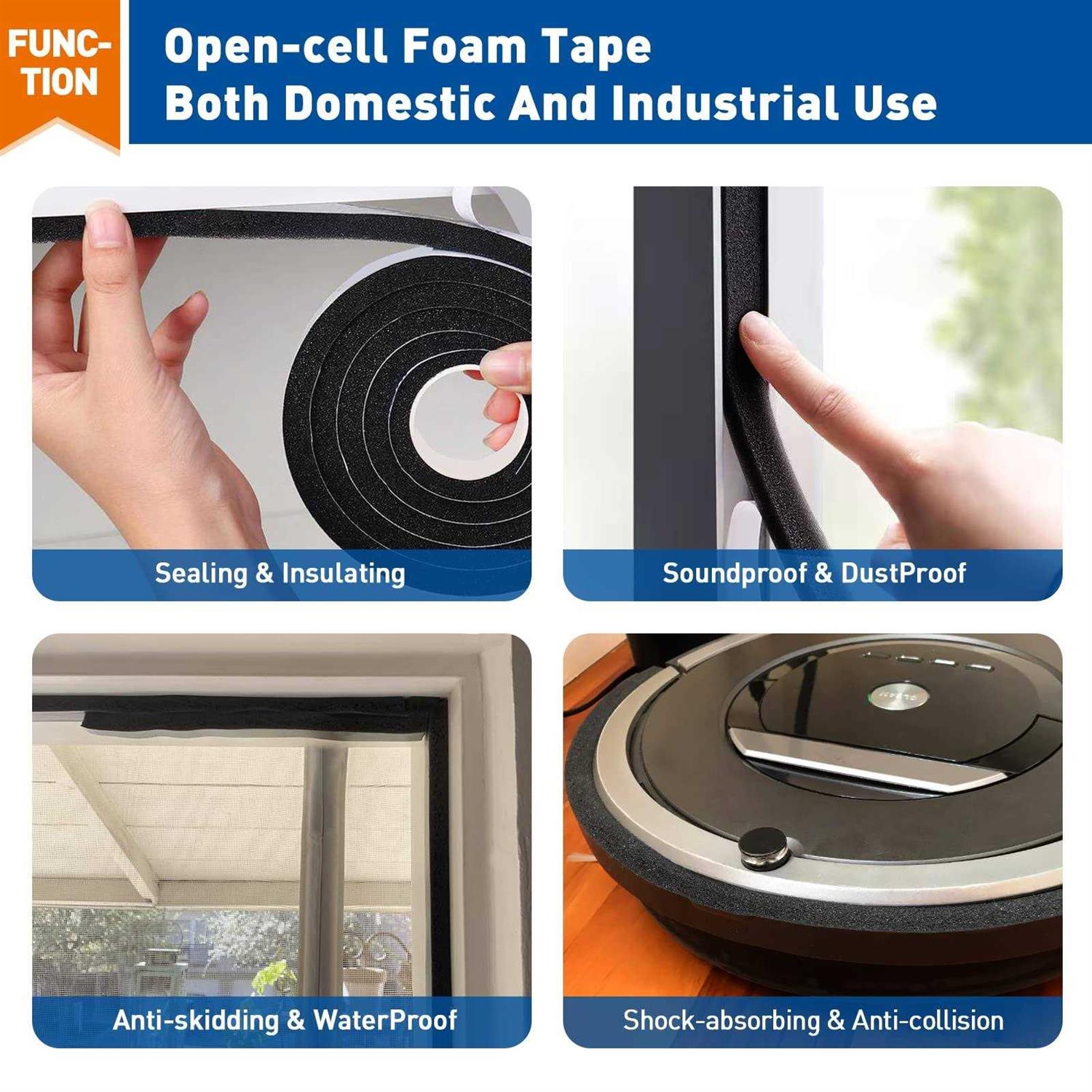 SIZE OF THIS FOAM TAPE – 1 inch W x 1 inch T x 6.5 ft L x 2 rolls. You can cut the single-sided weather stripping into any length you need by using a blade. HIGH-RESILIENT WEATHER STRIPPING – The open cell weatherstrip can recover to its original shape quickly after being compressed, which guarantees nice shock protection. STRONG ADHESIVE – The foam tape adopts a stronger adhesive backing which ensures the foam weather seal can stay in place without falling off once applied. GREEN MATERIAL – This harmless adhesive air conditioner foam seal is made of CR foam and neoprene, which is toxic-free and provides long-term protection. MULTI-FUNCTIONAL FOAM TAPE – This open cell foam weather stripping can be used for insulated, anti-collision, shock-absorbing, sound-absorbing, weatherproof, insect-proofing, and so on.