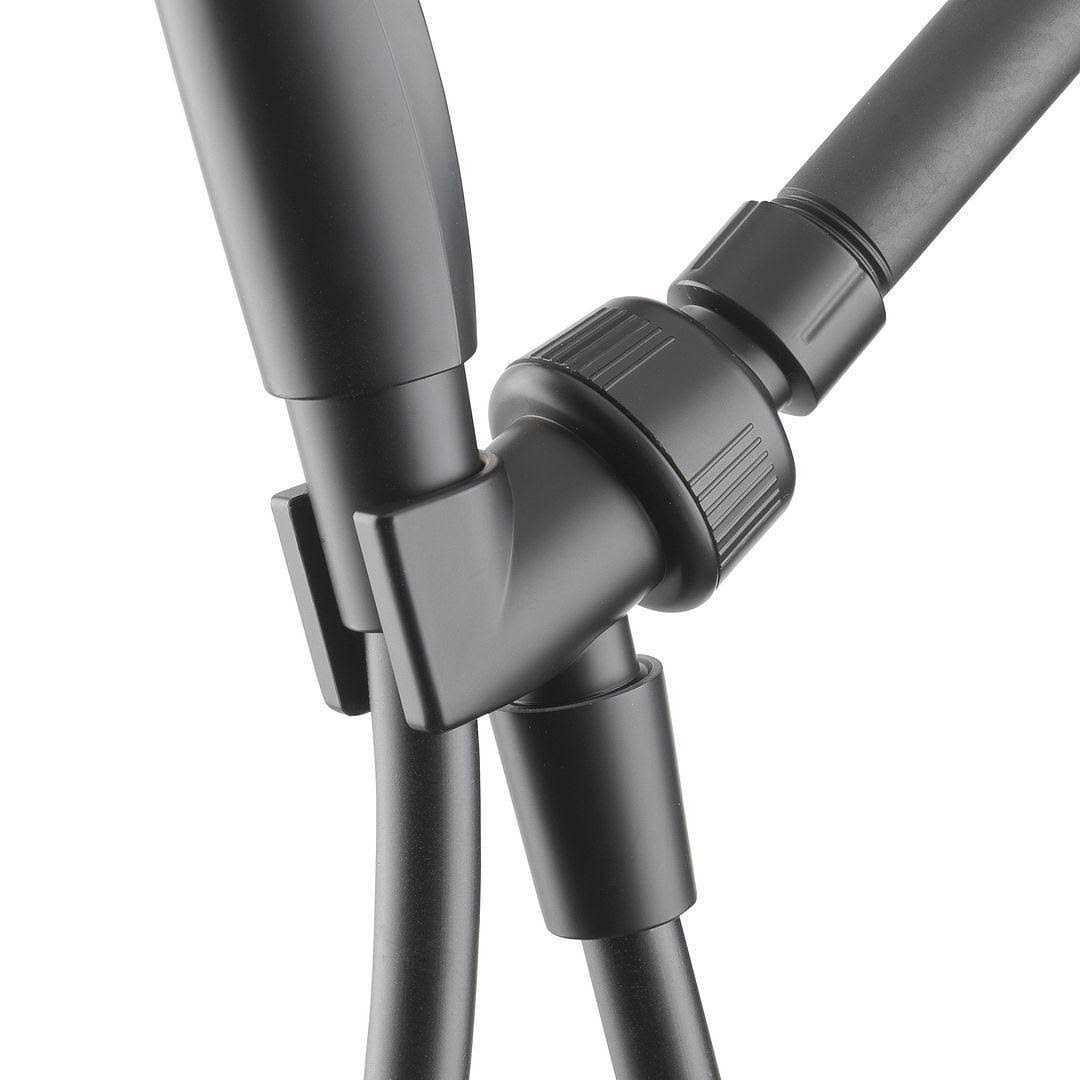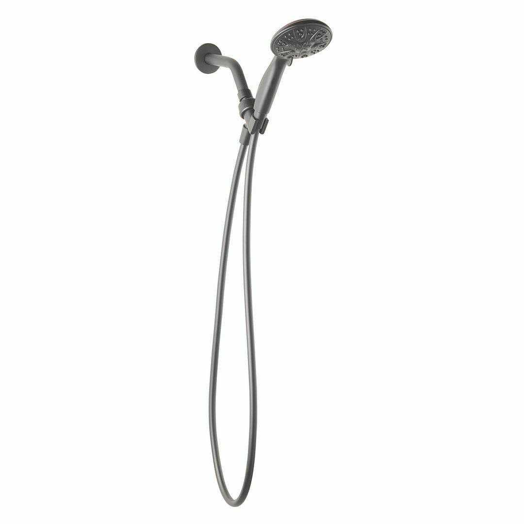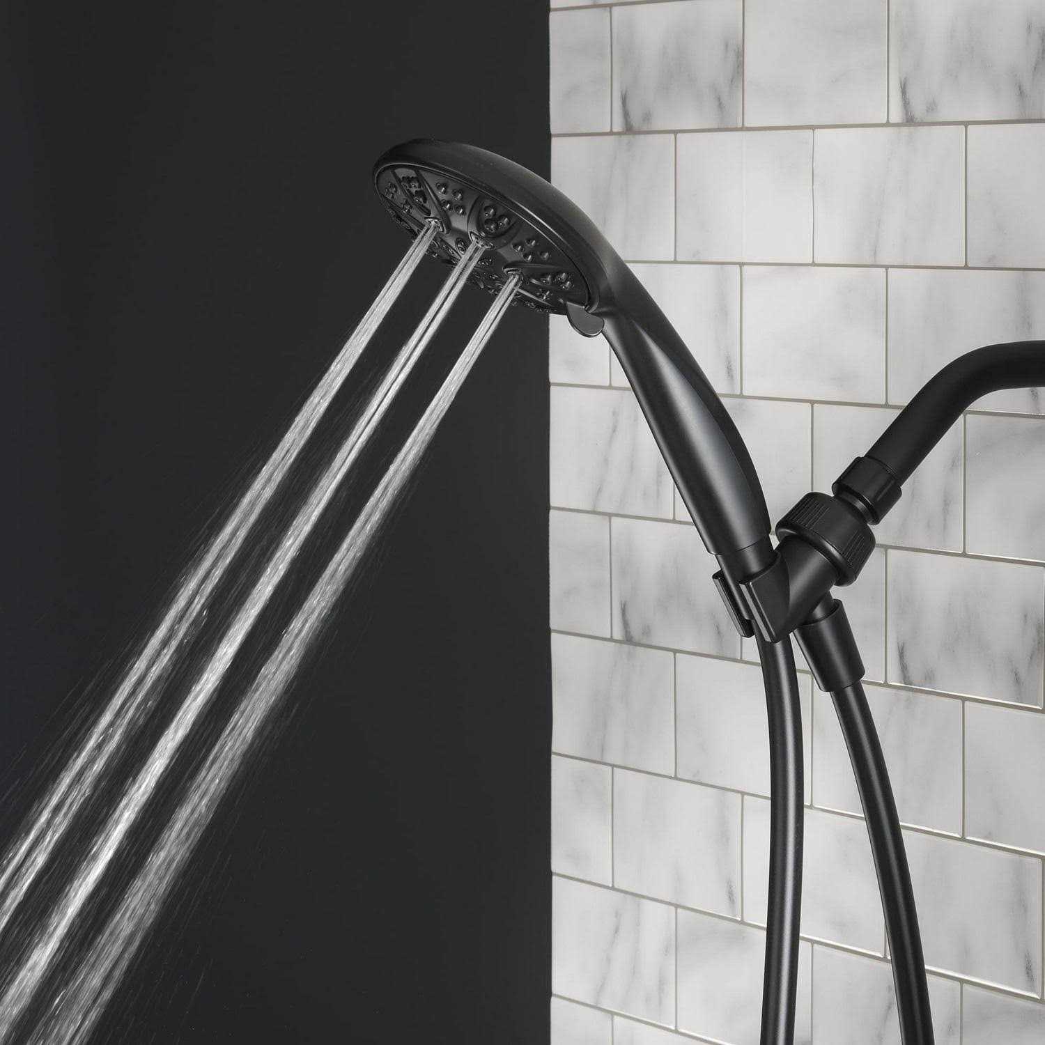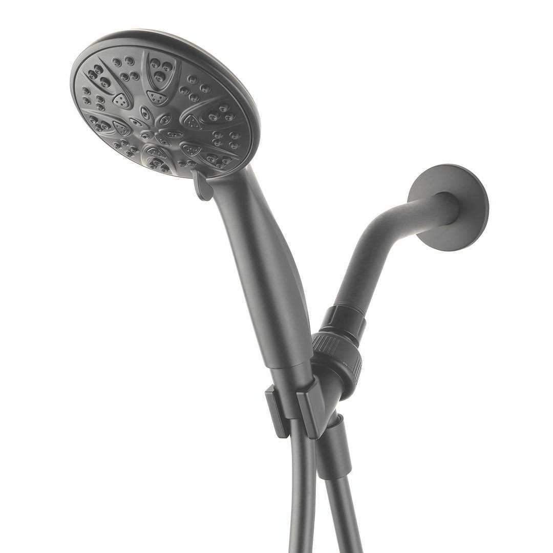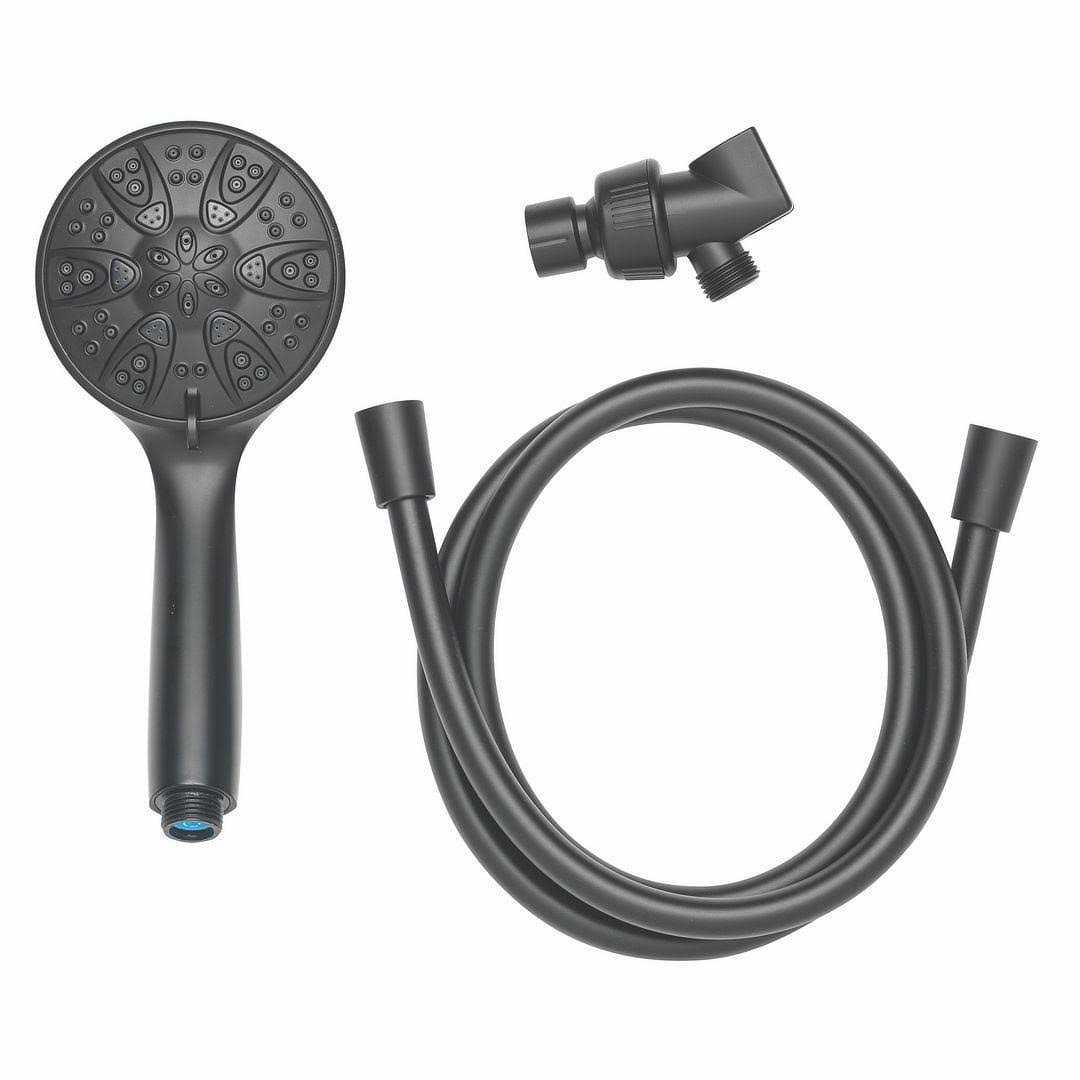 The Mainstays 5-Setting Handheld Shower Head features a sleek, modern matte black finish that is WaterSense certified to conserve water. Five water functions are available for a customizable shower preference: Full spray, power spray, full & power spray combo, massage, and pause. Note: The pause setting is designed to bring the water flow to as little as a trickle. It is not designed to completely stop the flow of water. Spray settings can be easily switched by rotating the lever on the handheld showerhead. The included 60 in. PVC hose provides flexibility for bathing pets or rinsing away soap in the bathtub. An included bracket holds the showerhead securely in place. Cleaning this matte black shower head with a soft, water-dampened cloth will protect the product and keep the finish looking its best for years to come.