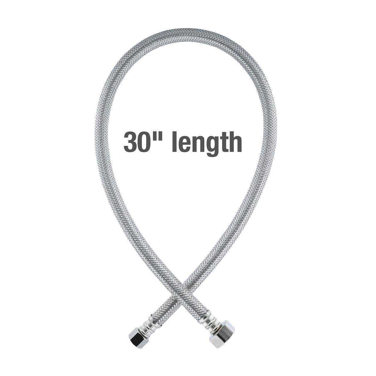 Connecting the water supply to your faucet is an easy DIY project with the Mainstays faucet connector hose. This 30 inch faucet supply hose features a chloramine-resistant inner core and washers built inside the nut fittings to seal and prevent leaks. There are nickel-plated brass nut fittings on both ends that ensure a solid connection on the inlet and outlet ends. The Mainstays faucet supply hose is IAPMO, ANSI/NSF61 and UPC approved. This supply hose is flexible and perfect for underneath sinks.
