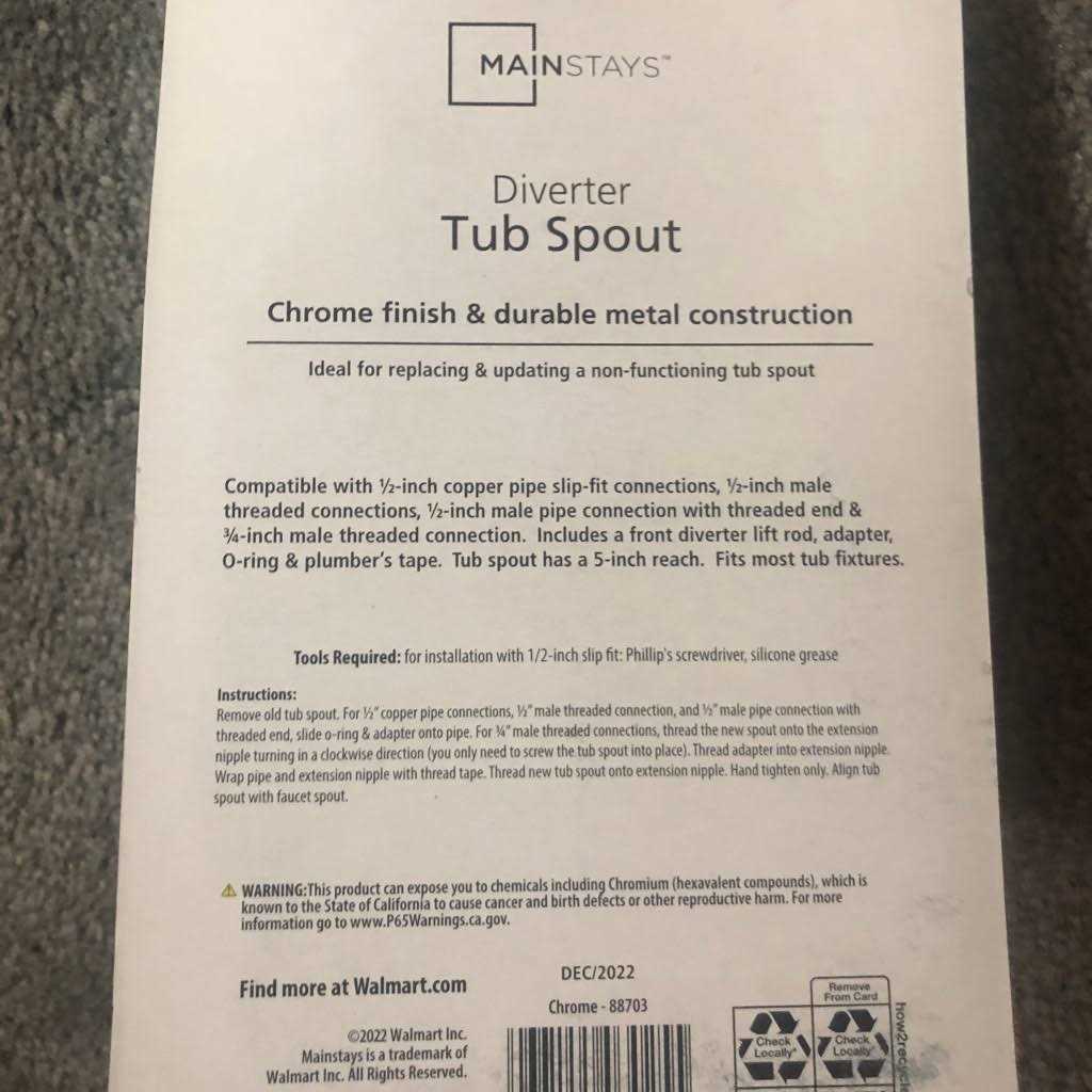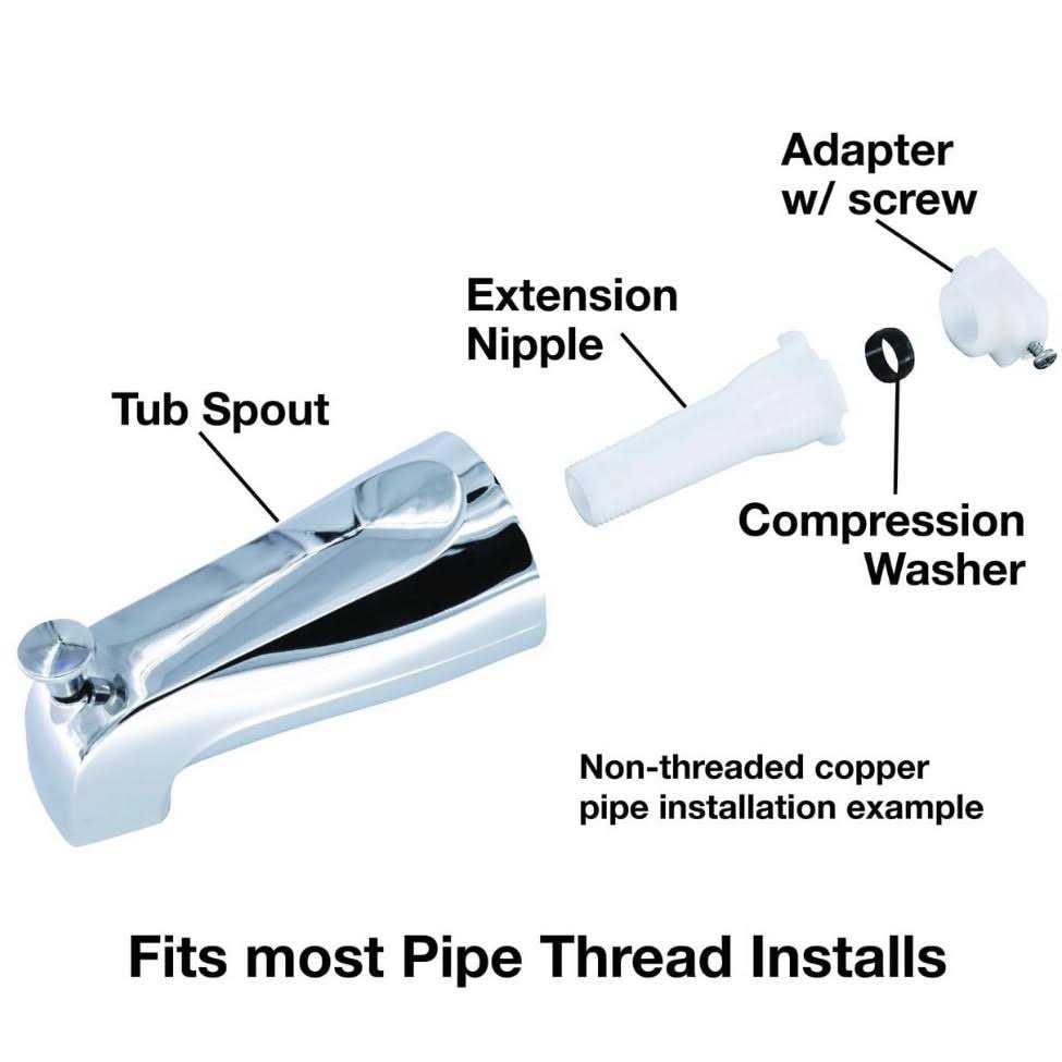 This simple DIY project will allow you to add a new style to your bath or replace an older tub spout that no longer works. Eliminate erosion, prevent unwanted cracks and save money with this quick update. This tub spout is constructed from metal for strength and durability in your tub/shower. It comes complete with adapters, and pipe thread tape for an easy and seamless installation. The spout is compatible with 1/2 inch copper slip, 3/4 inch threading and 1/2 inch threading, and 1/2 inch nose threading. For a sharp tailored look in your bathroom, choose Mainstays Chrome Diverter Tub Spout.