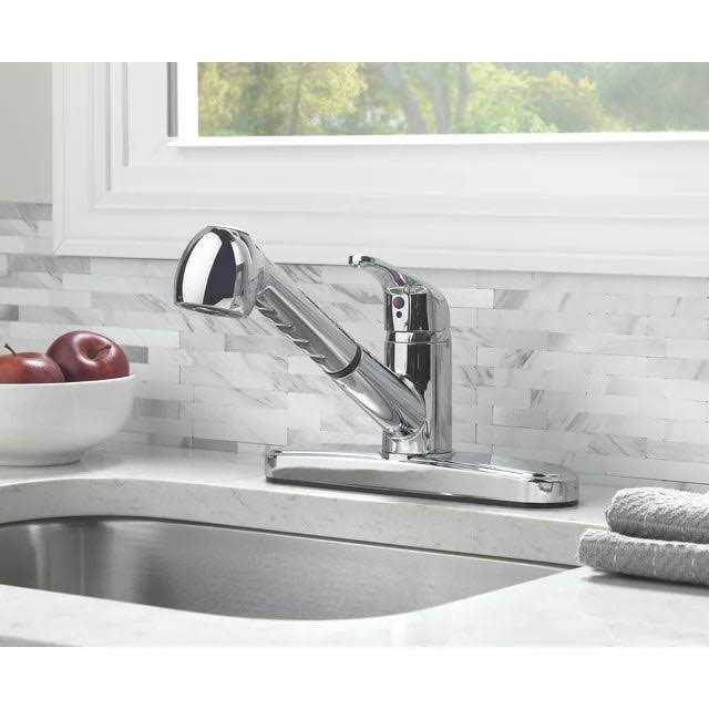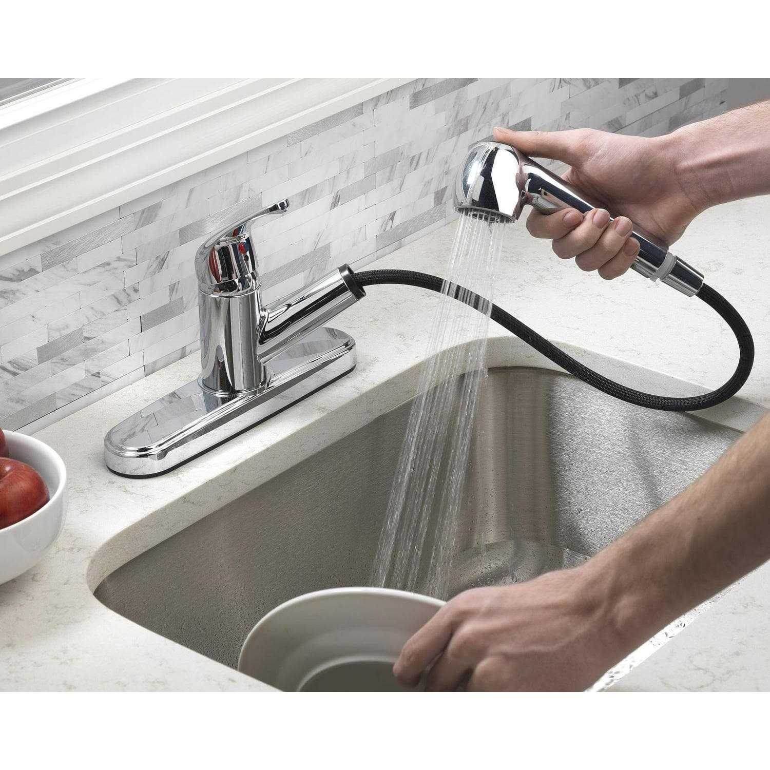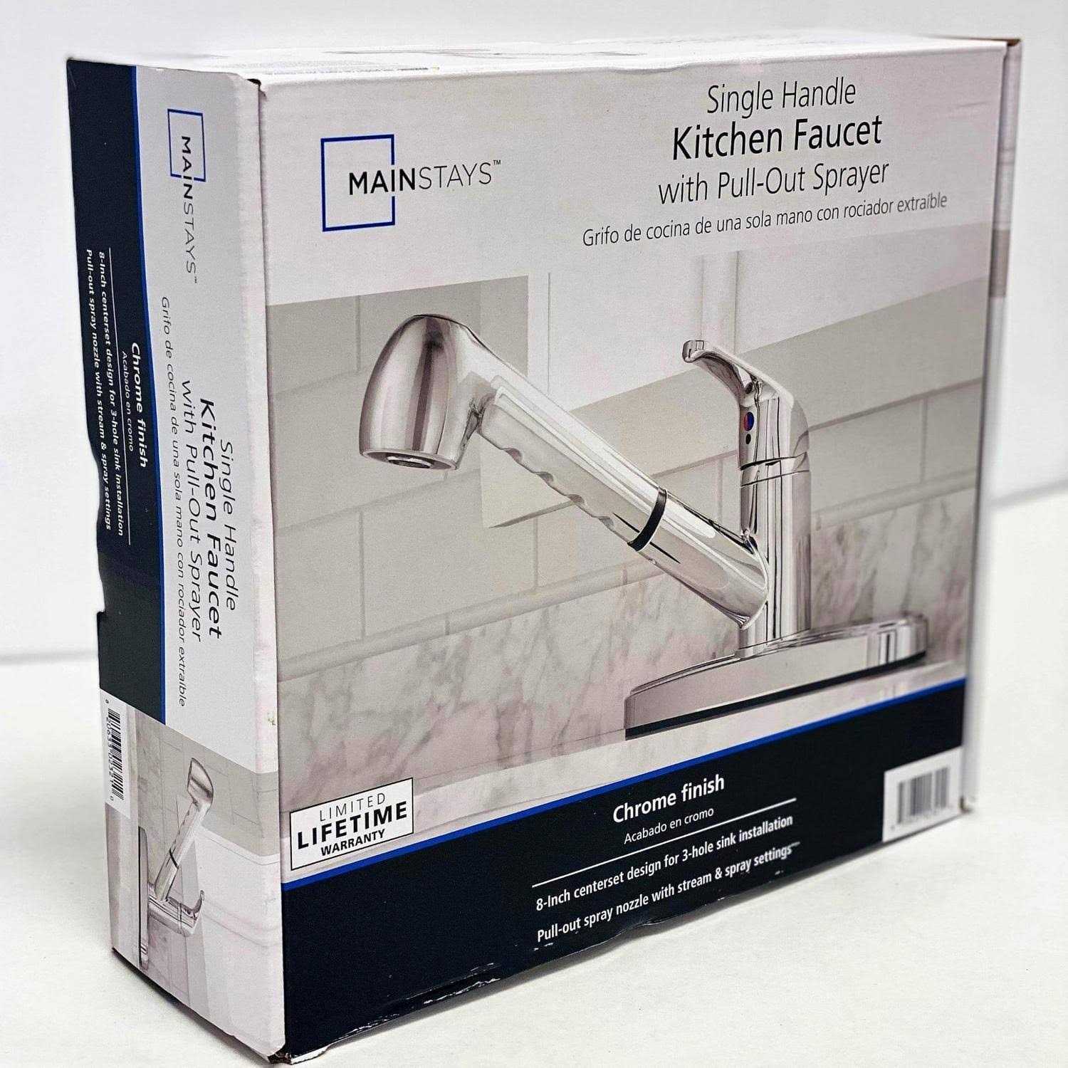 The Mainstays Single Handle Pull-Out Kitchen Faucet features a durable chrome finish with a 1.8 gallon per minute flow rate. The two-function options can easily switch from a stream or spray setting with the press of a button. The pull-out hose will provide you with a variety of mobility options while washing dishes or cleaning out the sink. This easy-to-install pull-out kitchen faucet is compatible with an 8-inch centerset design on 3-hole sinks. A ceramic cartridge ensures reliable, drip-free use. Cleaning this faucet with a soft, water-dampened cloth will protect finish and keep this faucet looking its best for years to come.