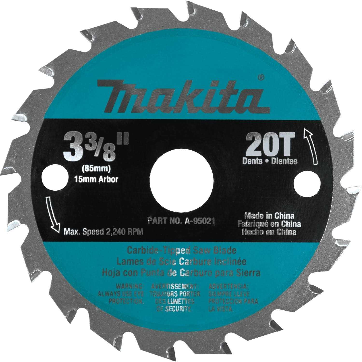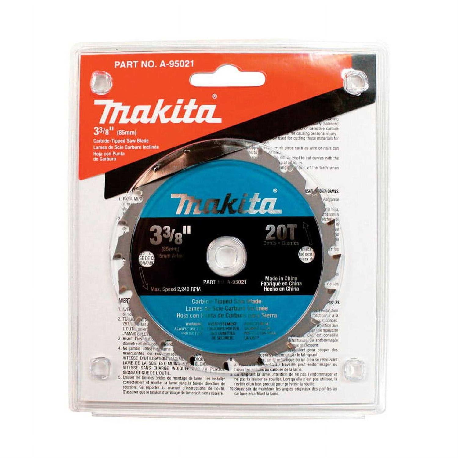 Product Description The Makita 3-3/8 inch carbide-tipped circular saw blade has an efficient 20 tooth design. The blade is expertly tensioned and engineered for true cuts. The carbide tooth design is engineered for quality cuts and longer life. Fully hardened and expertly hand-tensioned steel saw plates for true cuts Carbide tooth design for quality cuts and longer life Specially designed for cordless saws to permit more cuts per charge For use with Makita 3-3/8 in.