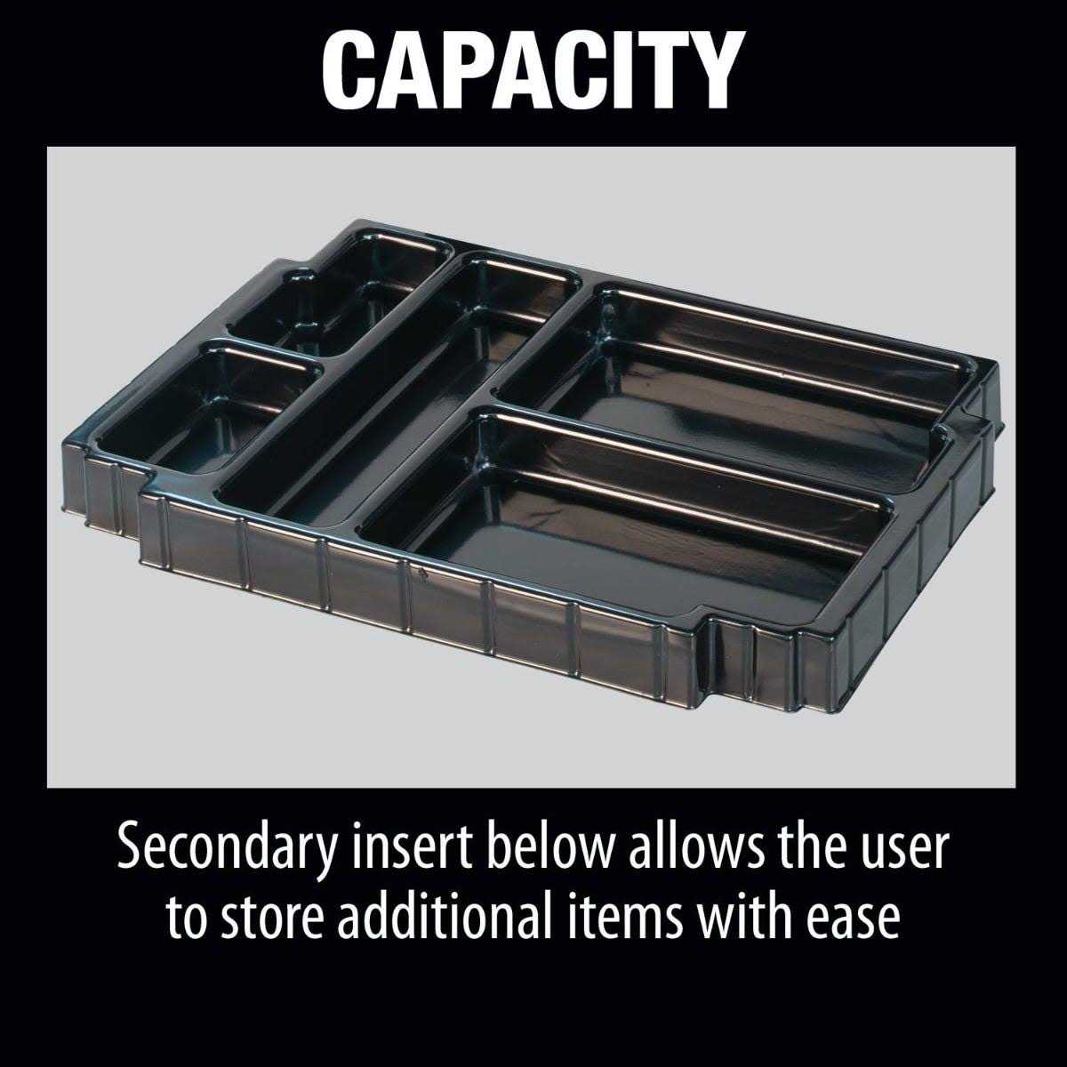 - Top tray insert features specific holders for the bits, the secondary insert below allows the user to store additional items with ease