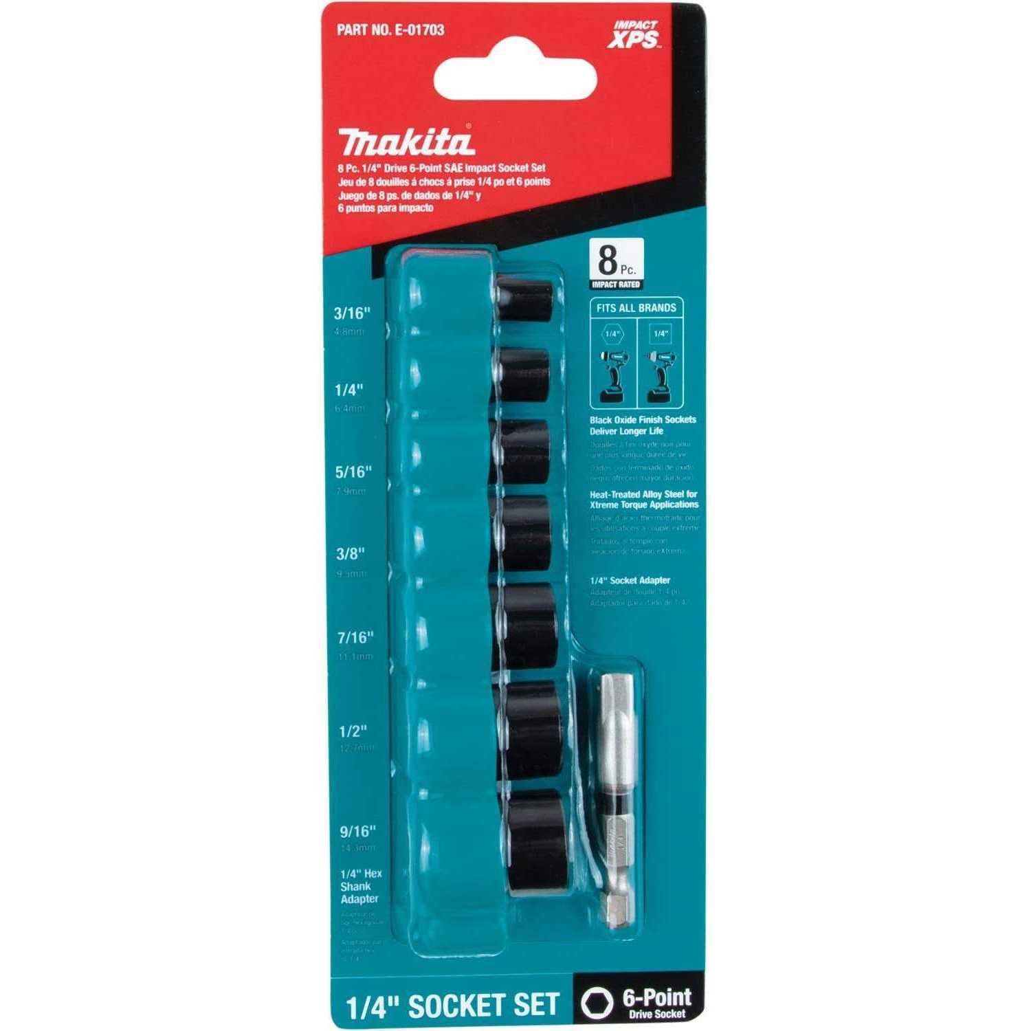 Makita E-01703 Impact XPS 8 Pc. 1/4 Drive 6-Point SAE Impact Socket Set w/Standard Socket Adapter