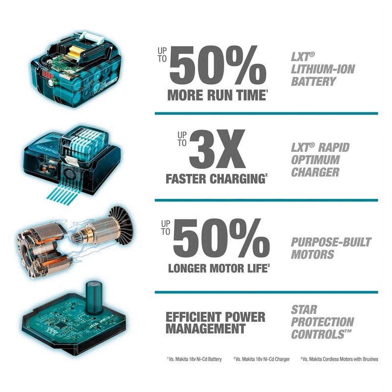 - Efficient BL Brushless motor is electronically controlled to optimize battery energy use for up to 50% longer run time per charge