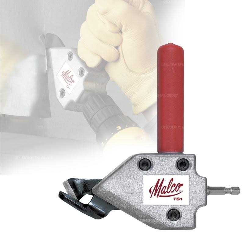 Overview for Malco TS1 This rugged but inexpensive accessory cuts straight and to the left and is capable of navigating tight curved patterns and squares in heavy 20-gauge (1.02 mm) galvanized steel. Blind cuts require only a 1/2”(12.7 mm) starting hole. Cutting applications include both ferrous and non-ferrous sheet metals, metal roofing/building panels, vinyl, steel mesh, ductwork, even the thick metal of furnace jackets, equipment enclosures or automotive body panels. An offset design keeps both hands away from work surface. Long-wearing hardened jaws are also replaceable.