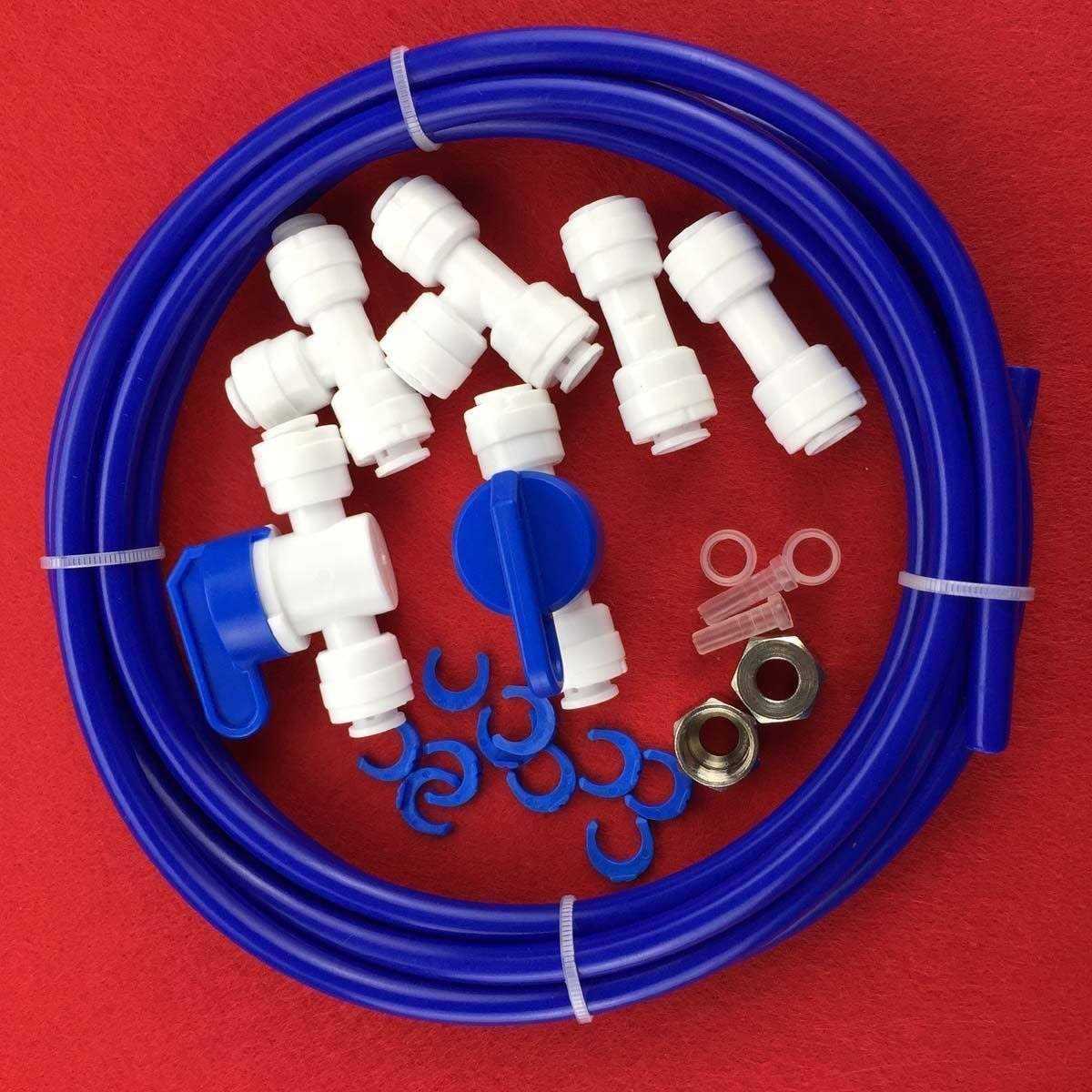 Connects RO systems to refrigerator ice makers for ultrapure water superior to fridge filters njoy clear, sparkling & delicious ice cubes and ro water at your fridge dispenser Includes 16-feet length of 1/4 inch tubing OD, 1 quick-connect T fitting & 1 quick-connect shut-off ball valve Works with most reverse osmosis and water filter systems using 1/4 inch standard tubing This high-quality ice maker kit will provide you with clear and sparkling ice cubes and drinking water at your refrigerator by routing purified water from your existing reverse osmosis system. You will never have to spend money on small, ineffective and expensive refrigerator filters ever an. his ice maker kit includes everything you will need to quickly and easily connect your refrigerator and reverse osmosis system. t includes one quick-connect “tee” fitting, one quick-connect shut off ball valve and 16 feet length of 1/4 inch food-grade poly tubing. he “tee” fitting diverts the ro purified water between the fridge and ro faucet giving access to both outlets. The ball valve can be used to shut off water flow to the fridge. and most standard under-counter reverse osmosis systems using 1/4 inch tubing and connectors.