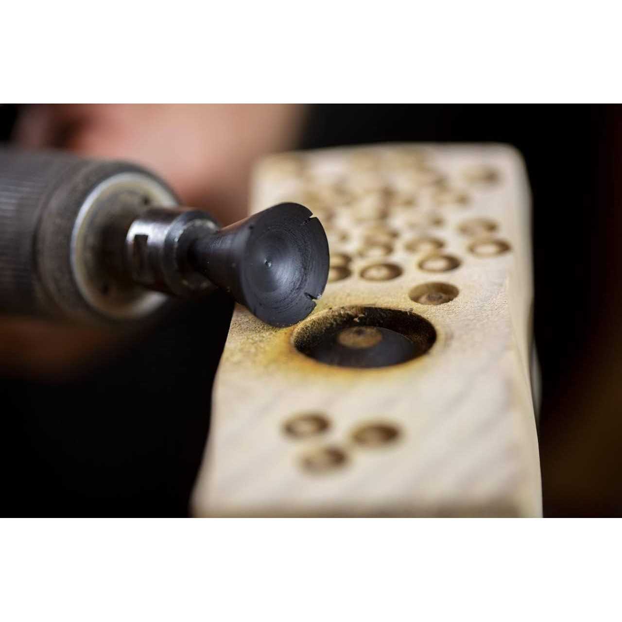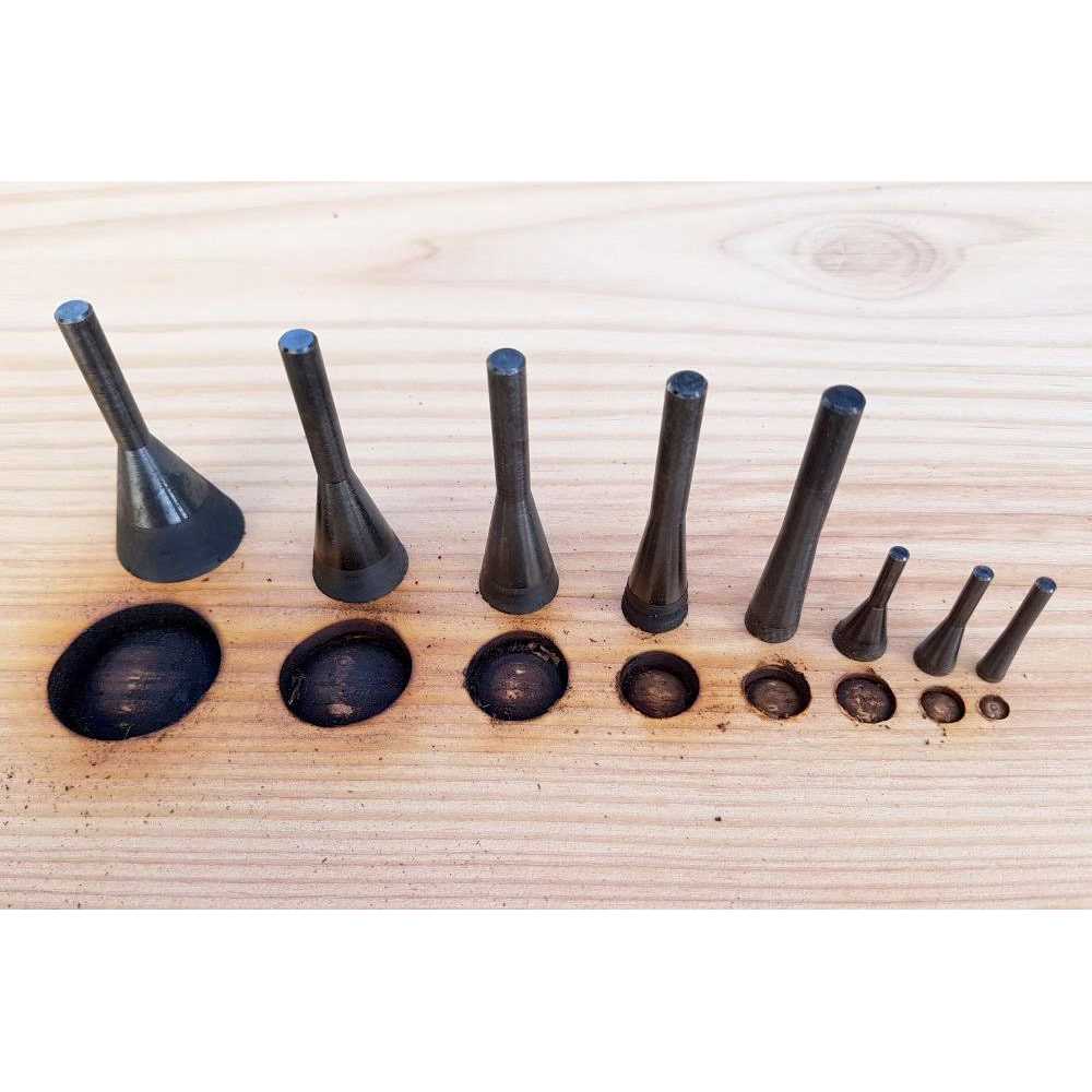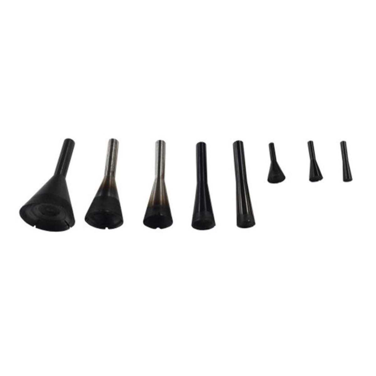 The Manpa Concave Eye Cutter 1/4″ SH 8pc is great for making the eyes on animals, birds and human sculptures as well as wavy patterns such as reptile scales. Excellent for texturing designs on woodturnings or before burning to further enhance your work. Depending on the pressure applied, these accessories are designed to naturally leave black circular rings as they burn wood which adds a phenomenal new dimension to woodturnings and woodcarvings. Recommended for small hand piece grinders or die and straight grinders. Not for use on rotary tool handpieces or air/electric grinders with a chuck.Includes: 25.40mm x 54.00 (H)mm, 19.00mm x 54.00 (H)mm, 15.90mm x 54.00 (H)mm, 12.70mm x 54.00 (H)mm, 9.5mm x 54.00(H)mm, 9.5mm x 25.00 (H)mm, 7.2mm x 25.00 (H)mm, 4.8mm x 25.00 (H)mm
