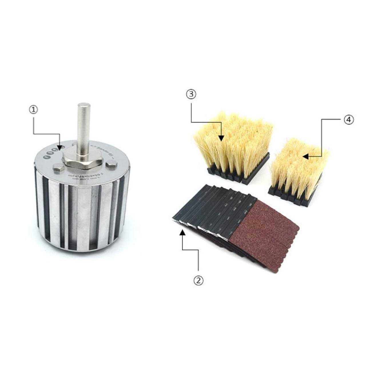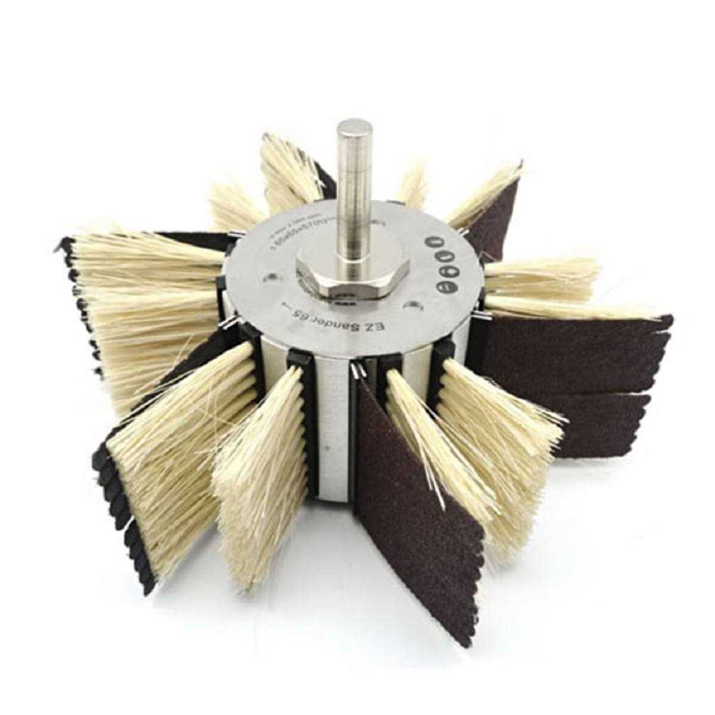EXCEPTIONAL DESIGN- The unique design on this larger sander means you fit 12 brushes and 6 sandpapers (#60 & #240 grit) in a two brush to one sandpaper ratio, all easily fitted (by sliding) them onto the central core. This neat assembly is then secured to the Manpa Keyless Chuck MP21-29 which is tightened on either the end of the Multi Extension Shaft MP21-28 or in combination with the Sanding Tool MP21-12. HIGHLY ADAPTABLE- For greater flexibility, the EZ Sander 65 can also be used with a 4-1/2” (115mm) variable speed angle grinder, and other drill chuck units, all at or below 2,500 RPM. These sanders are different because the combination of rotating brushes and sandpaper, simultaneously cleans up debris and sands the surface. These EZ sanders open up exciting new sanding methods while also greatly reducing fatigue and wear and tear on your body. REFINED POWER – With either or both extensions secured to your electric/battery power drills, this flexible EZ sander allows for rapid power sanding over large areas on nearly all wood surfaces. PROFESSIONAL FINISH SANDING – This is the largest core size (2-9/16” (65mm)) in a new range of top quality Manpa sanding accessories. It consists of replaceable slotted brushes and sandpapers (#60 & #240 grit) easily fitted to the central aluminum core. The brushes and sandpaper are specially designed to easily flex over all kinds of larger surfaces, flat, contoured or difficult, while simultaneously cleaning wood shavings debris and sanding the surface. Each brush and sandpaper have ten (10) slots (a.k.a. fingers or teeth).