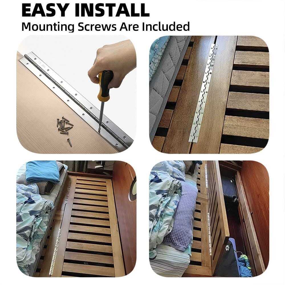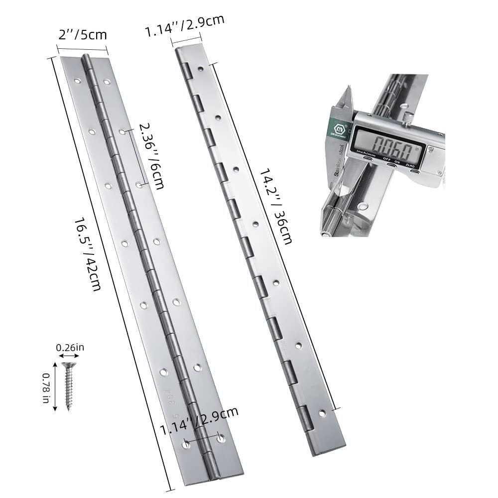 Screws are included. Heavy Duty Piano HingePremium piano hinges are made of high quality 304 stainless, Thick and wide design, High Polished Finish enhances rust-resistant and built to last, it will last for years in just about any environment, even in saltwater circumstances. CONCISE LOOKPiano hinges have a high polished surface the beautiful look allowing them to effortlessly blend in with the decor of any home. Easy OperationStandard countersunk screws holes design is easy to install and fix screws. Nicely welded and extremely silent. Ensures that hinges open smoothly and quietly. Widely Use Panels, Cabinet door, industrial kitchen equipment, metal storage cabinets, wardrobe doors, tool boxes, jewelry boxes, Storage boxes, Bed frames, Seat Back Hinges, or any DIY woodworking projects.