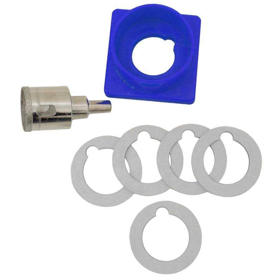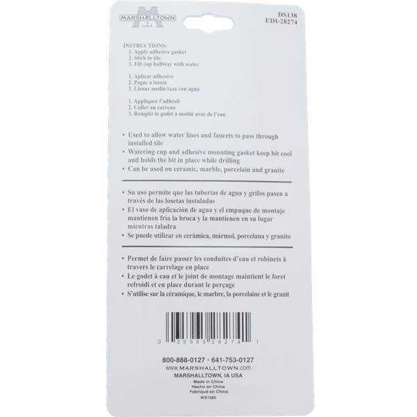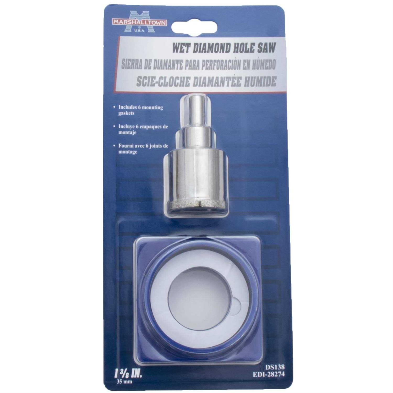 The MARSHALLTOWN Wet Diamond Hole Saw is used to allow water lines and faucets to pass through installed tile. The diamond-tipped drill bit cuts a 1⅜” diameter hole in tile, and the watering cup and mounting gasket keep the bit cool while holding the bit in place when drilling. The Wet Diamond Hole Saw comes with six mounting gaskets and can be used on ceramic, marble, porcelain, quartz, and granite. The replacement part comes with twelve mounting gaskets.