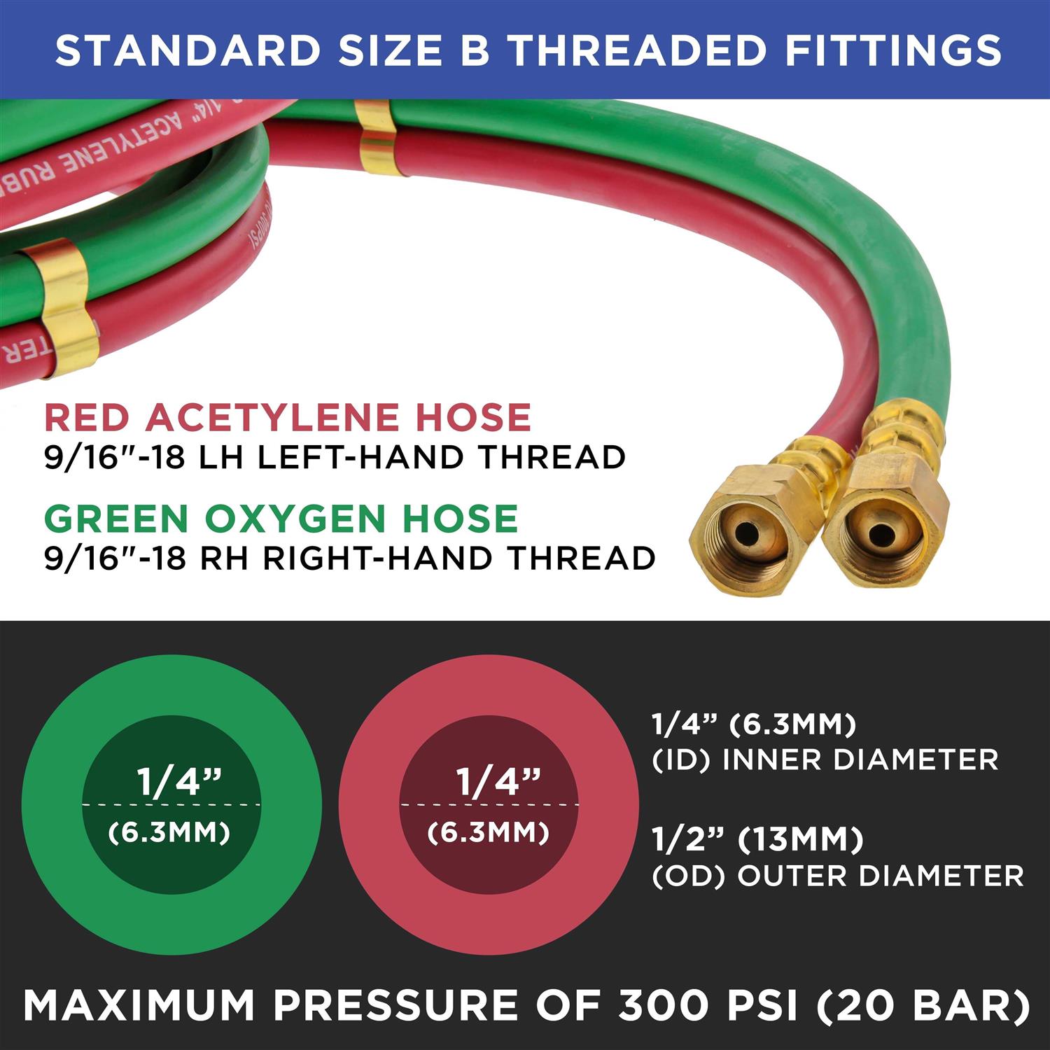 A durable, flexible twin hose set designed for transporting oxygen and acetylene gases to your welding torch, brazing, soldering, and cutting equipment. These R-grade long-lasting hoses are ideal to use while working on all of your metalworking projects. Both the oxygen hose and acetylene gas hose have a 1/4-inch (6.3mm) (ID) inner diameter and a 1/2-inch (13mm) (OD) outer diameter and have a maximum pressure of 300 PSI (20 Bar) to supply an optimal flow rate. The hose set has a color-coding system, so you can distinguish that the green hose is for oxygen and the red hose is for acetylene, and this will ensure safe and accurate connections to your regulator and oxy torch. All four hose ends of the twin welding hose set come with standard size B threaded fittings. The fitting sizes are 9/16″-18 LH left-hand thread for the red acetylene hose and 9/16″-18 RH right-hand thread for the green oxygen hose, which enables the hoses to connect onto existing standard regulators and torches. The 50-foot (7.6m) long torch hoses enable you to safely keep the tanks away from the torch tip while in use. The welding hoses are long enough for mechanics shops, production line welding, and other indoor and outdoor construction, industrial, and agriculture uses. Our durable, flame retardant, flexible twin welding hoses are fused together and are resistant to kinking, cracking, abrasion, and weather, unlike other hose sets that easily crack or leak, creating a fire hazard. They stay flexible in extreme temperatures from -4°F to 158°F, making them ideal for long-term use. Six zip ties included.