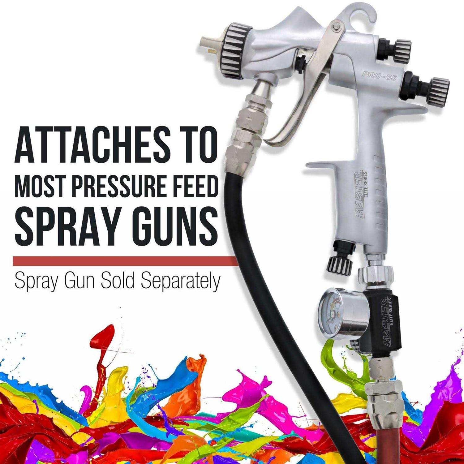 Master Elite Series 25 foot air and fluid hose assembly set with fittings. A premium heavy duty hose assembly for use with pressure feed spray guns paint pressure pot tanks and for use in any industry from automotive industrial to woodworking.
