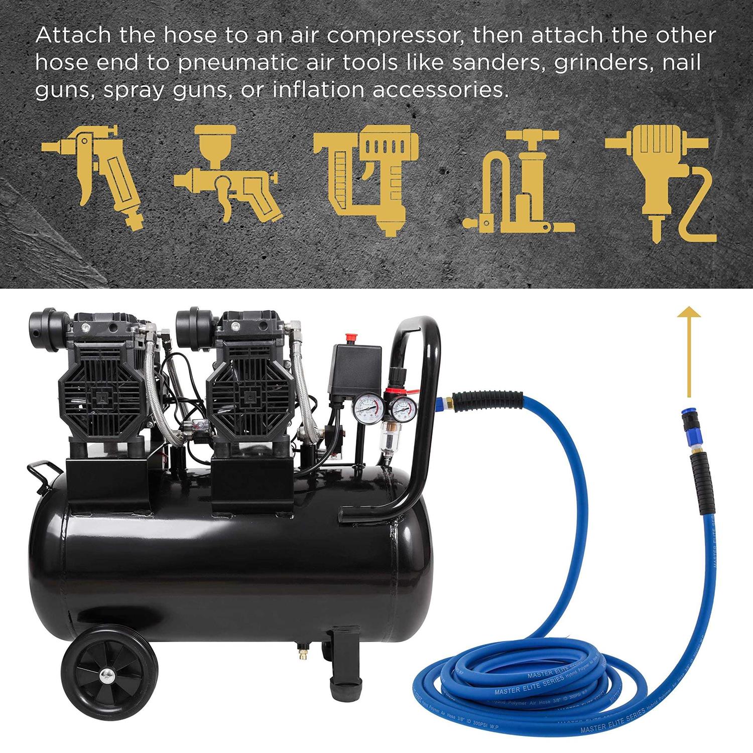 This 3/8 inch ID heavy-duty pvc/rubber hybrid material air hose is super strong, very flexible, and lightweight, weighing 30% less than most rubber hoses. This high-performance super flexible hose is designed to be twist, kink, mar, and bend resistant. The hose has a maximum working pressure of 300 PSI. A versatile premium air hose that is ideal for multiple applications, including auto repair shops, body shops, construction job sites, and homes and garages. Attach the hose to an air compressor, then attach the other hose end to pneumatic air tools like sanders, grinders, nail guns, spray guns, or inflation accessories. The included 1/4 inch aluminum universal quick-coupler has a simple push-to-connect plug connection design, and the coupler accepts all 3 standard styles of interchange plug types, Industrial (I/M), Automotive (T), and ARO (A). A durable all-weather air hose that maintains flexibility even in extremely cold temperatures (-40F to 150F). It is oil, chemical, and electrically resistant.