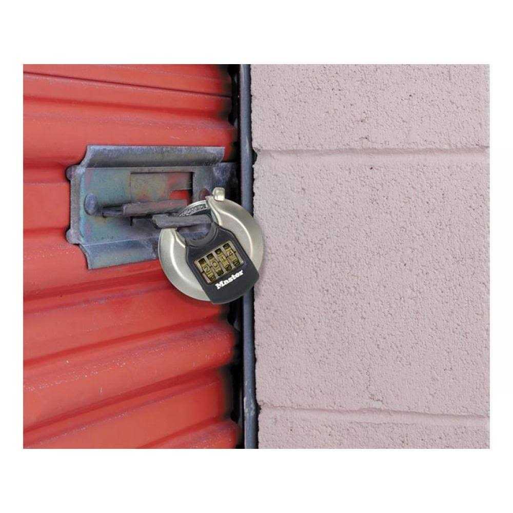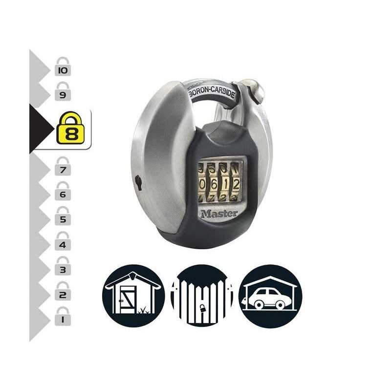 This Master Lock Excell discus padlock is ideal for protecting your belongings in self-storage units, garages, storage lockers or lorries. This discus padlock consists of a wide, stainless steel body for strength, reliability and corrosion and weather resistance, and an octagonal shackle made of boron carbide, which is 50% harder than hardened steel, for maximum resistance to cutting and sawing. It also a has a reinforced body bumper for scratch resistance. You can set your own 4-digit combination so no key is needed to open the lock. For added security, the combination can only be changed using the included reset key.