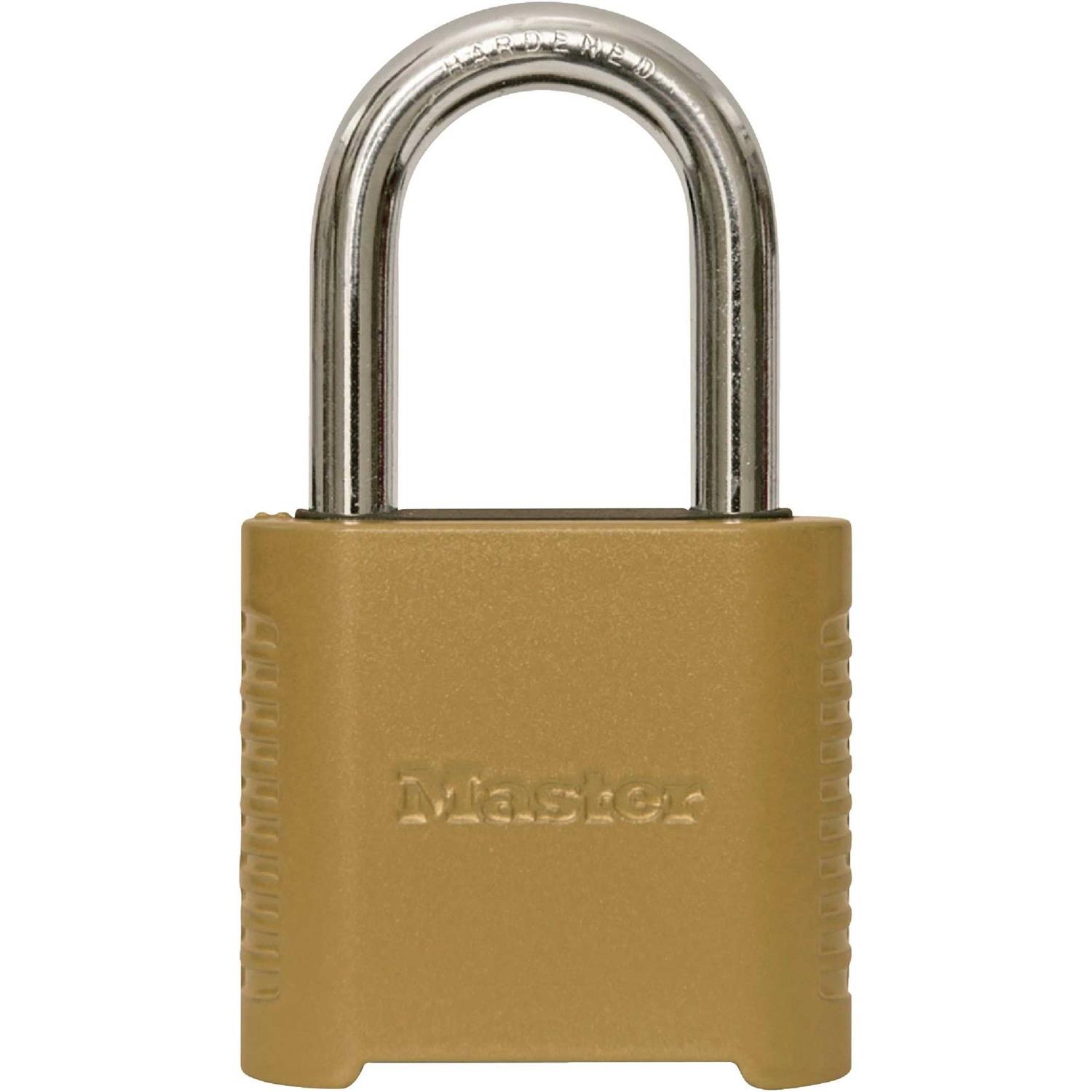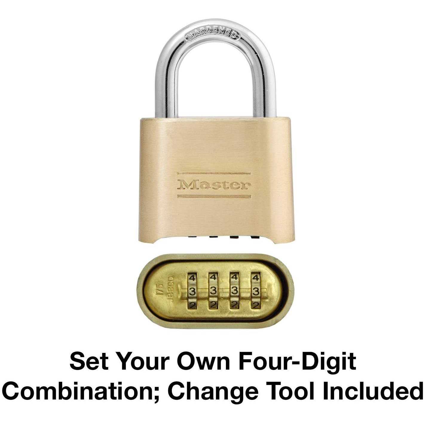 Combination Padlocks by Master Lock. Details:The Master Lock 175D Set Your Own Combination Padlock features a 2in (51mm) wide solid body for strength and reliability. The 5/16in (8mm) diameter shackle is 1in (25mm) long and made of hardened steel, offering extra resistance to cutting and sawing. The 4-digit dialing allows for thousands of possible numeric combinations.