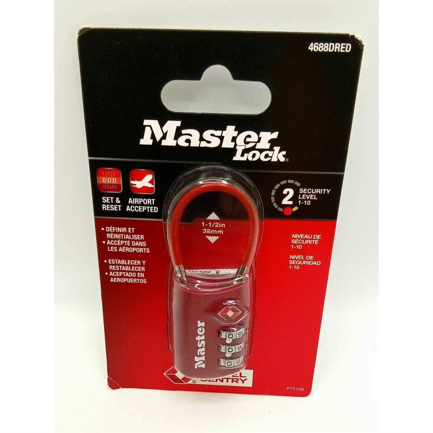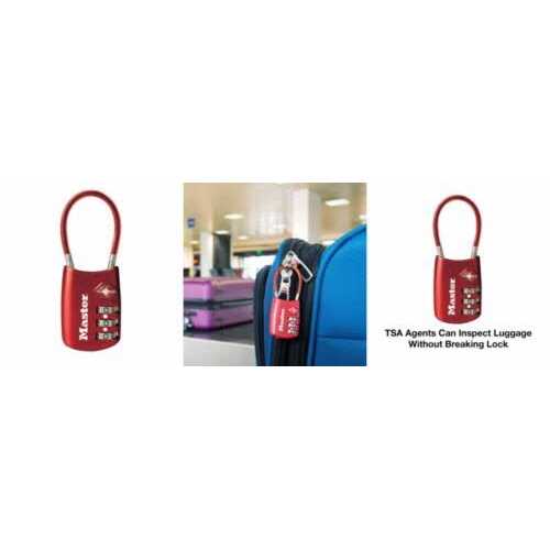 Suggested uses, luggage, backpacks, bags, small cabinets, briefcases, computer bags, for indoor use only 1-1/8-inch metal body Set your own combination convenience Bright colours simplify baggage identification Master Lock 4688DBLU TSA accepted set your own combination luggage lock with flexible cable. Allows TSA screeners to inspect and relock baggage without damaging the lock. Flexible cable resists abuse from airport luggage handling equipment. 1-1/8-inch (30mm) wide durable metal frame. Three dial set your own combination convenience.