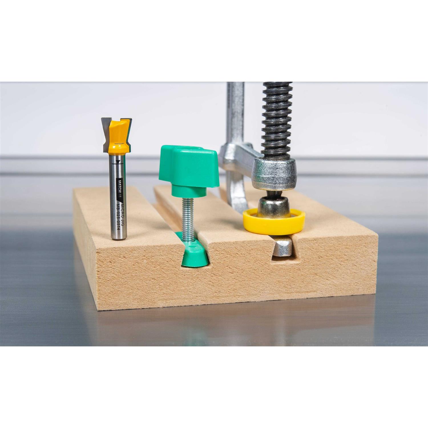 The MATCHFIT Dovetail Router Bit is specifically designed for the match fit Dovetail clamps and Dovetail hardware. Its unique design uses the same standard 14°, ½ profile, but with rounded corners. It routes incredibly clean Dovetail grooves and requires less sanding, making the match fit system faster and easier than ever before. Down Shear – the 8° down Shear utilizes the bit’s rotation to evacuate chips and dust, reducing friction, and heat, resulting in cleaner cuts. Bottom round over-the bottom of the Dovetail Groove Bears the majority of the clamping pressure. The 1/32 round over strengthens that bottom corner by removing less material. This is especially important when routing grooves in plywood, as it minimized the the possibility of plies Separating. Top round over – the 1/16 round over at the top of the Dovetail Groove has several functions. Firstly, it prevents tear out and fuzz, significantly reducing the amount of sanding needed. It also provides a range of tolerance.