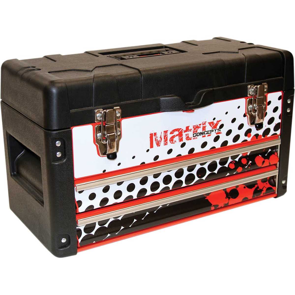 Width, 12 in. Depth, 12 in. Height, Each – Matrix Concepts M31 Worx toolboxes are just the thing to keep your tools with you and in order when you’re heading to the track. These portable hybrid, high-impact plastic and metal boxes are lightweight, yet strong. They are equipped with two ultra-smooth, ball bearing metal drawers with aluminum trim, a handy removable plastic tool tray, and feature the Matrix team graphic. M31 Worx toolboxes also have locking drawers, and are available in several colors.