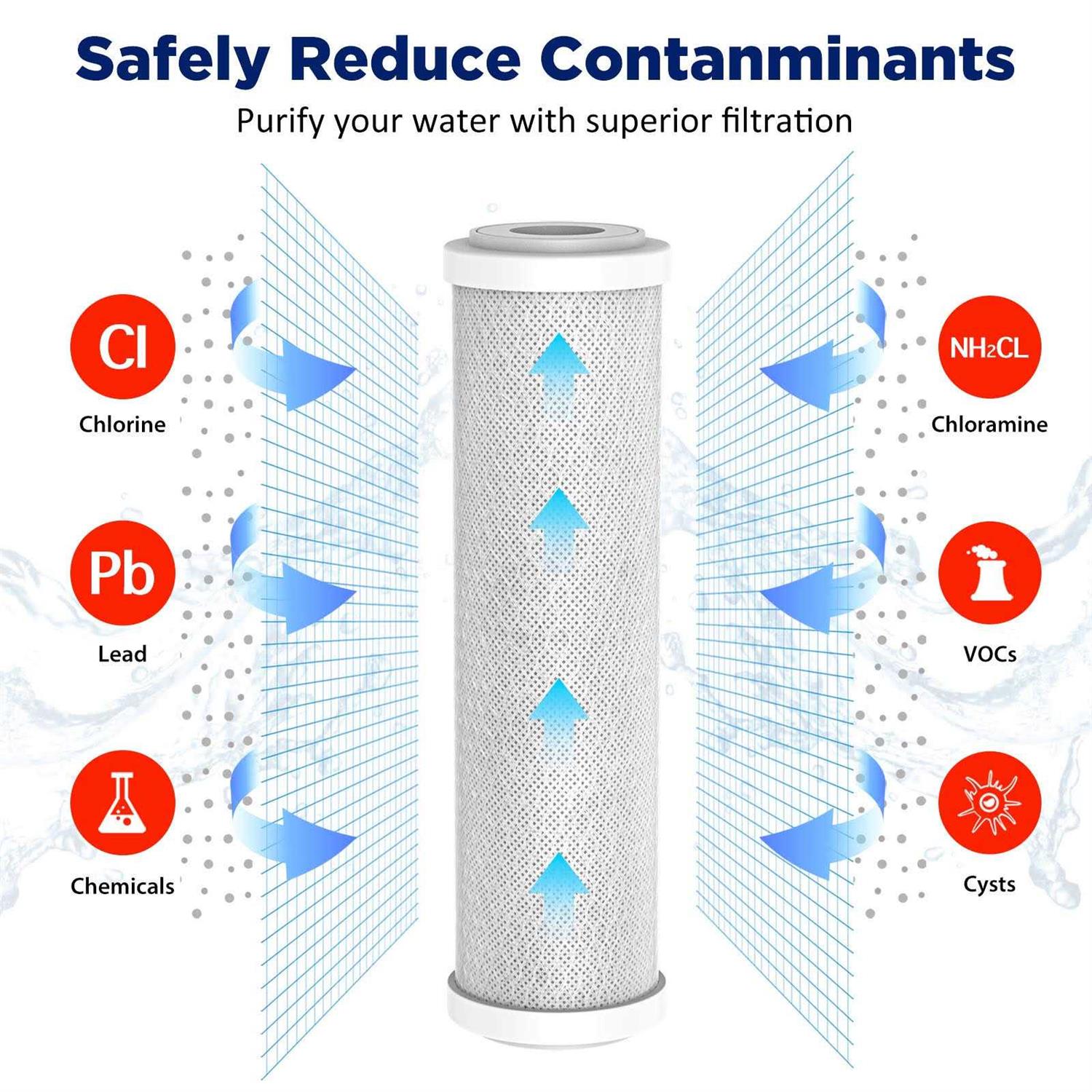 Membrane Solutions Replacement Water Filters Cartridge 2 Carbon Block Filters and 1 RO Membrane 50GPD MS carbon block filter is made of premium coconut shell carbon with a unique micropore structure. The outer layer has plastic net wrapping PP non-woven fabrics to steady the filter structure and expend its lifetime. Durable and sealed end caps with sealed silicone O-ring prevent leak. MS Residential RO Reverse Osmosis Membrane offers an exceptional balance of flow and premium rejection, ideal for low feed pressure residential applications. Carbon Block Filters Specification Micron rating: 5 Micron Size: 10” x 2.5” Max. Pressure: 80 psi Max Temperature: 104°F (40°C) Material: Premium Quality Coconut Shell Carbon Lifetime: Replace the cartridge every 6 months or earlier depending on your water quality. 50 GPD Membrane Filter Information: Material: RO Membrane Model of Element: ROULP-1812-50 Type: Reverse Osmosis Purifying Position: Terminal Purification Average Permeated Flow: 50 GPD, equal to (0.19)m3/d Stable Rejection Rate: 97% Minimum Rejection Rate: 95% Test pressure: 60psi Carbon Block Filters Compatible with: EP-10, DuPont WFPFC9001, Whirlpool WHA2BF5, watts WCBCS975RV, GE, Culligan, etc. Fits all major brands of standard size whole house water filtration systems including Whirlpool, Ecopure, Omni, Culligan, Watts, Filtrete, 3M, GE, and DuPont MS 50GPD RO membrane Compatible with System Model: All standard RO systems Fits 5SV, 4SV, Manifold, and Zero Waste systems Watts Premier 560014 Membrane 110009 GE TFM-24 Compatible FX12M Fits GE ROM-26T, 155431-19, RO-3167, TFM-24-PL, WRO-31687 Axeon TF-1812-25 Dow Filmtec TW30-1812-24 What you get: 2 x CTO Filter Cartridge 1 x RO Membrane 50 GPD
