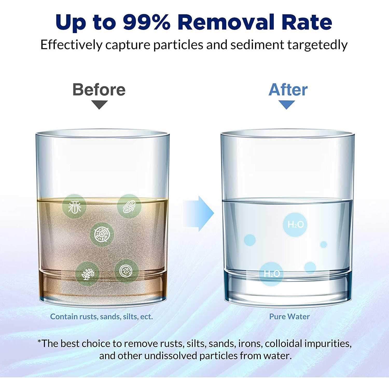 SAFETY MATERIAL: Food grade 100% Polypropylene material, Lead and BPA-Free. Non-toxic, odorless, no leaching or secondary pollution. Providing a healthy, safe water-filtering experience. MULTIPLE ADVANTAGES: This String-wound sediment water filter has FOUR times the dirt holding capacity and DOUBLE the flow rate of PP sediment filter, allowing for longer service life. It’s the ideal solution if your feed-water is of low quality and contains a lot of sediment. STANDARD UNIVERSAL SIZE: 5-Micron 10 x 2.5-inch universal filter cartridge size, fits most 10-inch filter housings. Used as a prefilter for reverse osmosis (RO) and whole house water filtration systems, and various commercial and industrial applications. PROTECT WATER EQUIPMENT: This filter removes up to 99% of sediment, including rusts, silt, sand, and other undissolved particulates from feedwater. As the first-stage filter in the whole house filtration system, it protects your post-filters, water appliances, pipes, bathroom, and kitchen faucets and shower fittings from clogging, providing a healthier filtered water supply for your home. LONG-LIFE FILTER: Our high dirt-loading capacity sediment filters can last up to 20,000 gallons. The filtered capacity and change-out cycle depends on the inlet water quality. Replace the filter at least every six months to maintain performance. HIGHER DIRT-HOLDING CAPACITY: The string wound filter has a deep graded honeycomb structure, dense near the inside core and more open and sparse near the outside edge, forming an effective depth filtration filter, catching larger particulates first and then smaller near the center core, effectively increasing the dirt holding capacity of the filter. ️ Note: Filters with a new or old packaging randomly sent. Product Description STRING WOUND WATER FILTER CARTRIDGE Excellent choice to filter sediments from the potable well or tap water. As the first line of defense in the filtration system, it can effectively prevent the clogging of water pipes and prolong the service life of water equipment. UNIVERSAL FIT Widely fits most 10-in x 2.5-in whole house drop-in style filter systems from major brands including 3M, GE, Culligan, Dupont, OMNIFilter, APEC, Olympia, US Aqua, Aquasana, Costway, Whirlpool, Smart Aqua Life, Geekpure, and others. WATER PRE-TREATMENT Pre-filtering treatment of many filtration systems, like Whole House Water Filtration System, Well Water Filtration System. Widely used for food and beverage industry, like Beer and