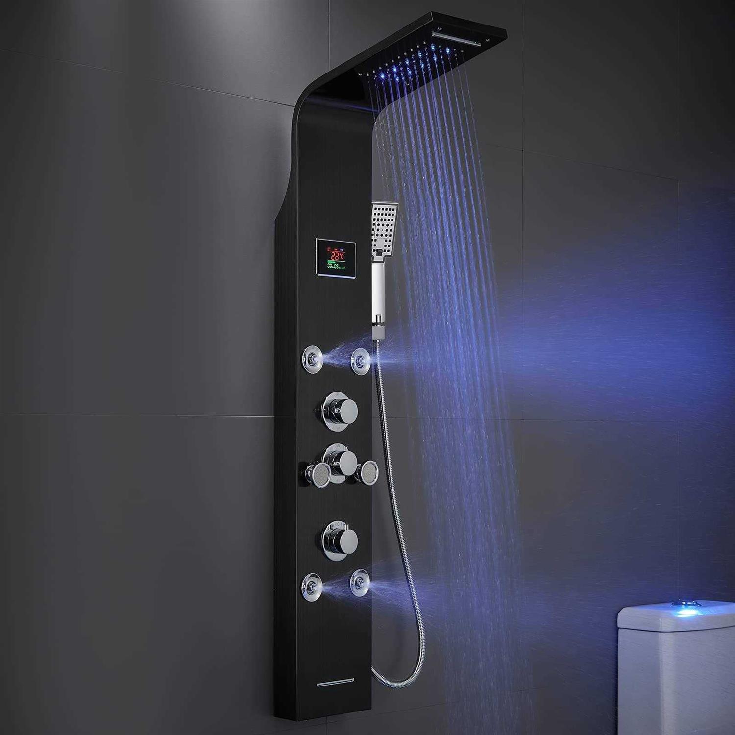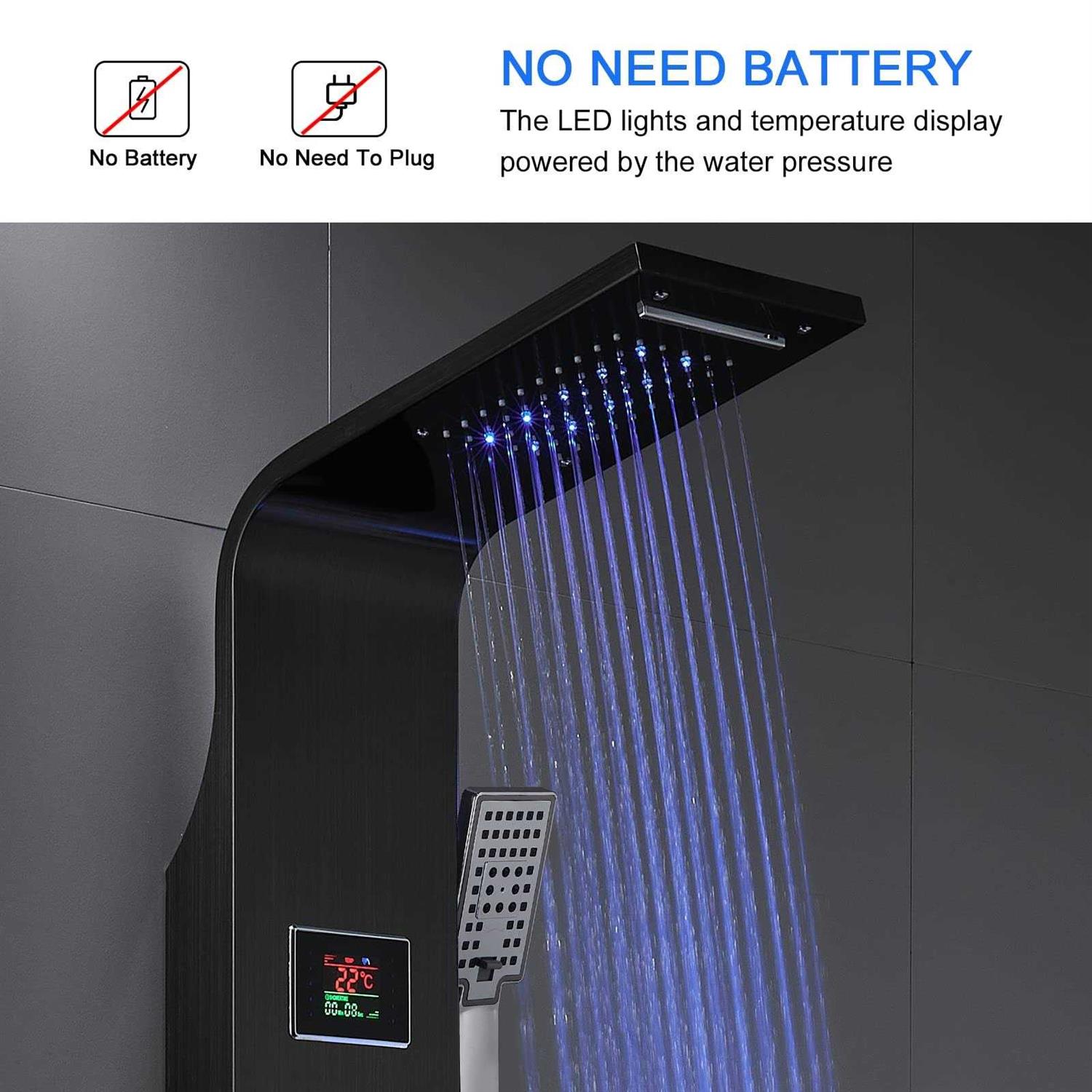 【Upgrade design】This Shower Panel System comes with LED lights & Temperature display. And there is no need for additional power connection, also no troublesome battery replacement, The LED lights and Temperature display powered by the water pressure. 【6 IN 1 Shower Panel】This LED lights shower tower system features rainfall waterfall shower head, 2 body jets, 4 mist sprays, 3 setting handheld shower, waterfall tub spout and water temperature display, a completer shower column system. 【Premium Materials】The Shower Panels made of SUS304 Stainless steel frame, Brass valve control system,Stable performance and high reliability. 【6pcs Adjustable Body Jets】 2 Protruding round jets and 4 massage mist sprays warm and soothing water onto your tired and sore muscles, thus providing effective relief from muscle pain and leaving you feeling refreshed; All jets can be adjustable the angle to suit everyone, from the tallest to the shortest, for a truly customized shower experience. Color:Black Product Features The shower panels tower system adopts SUS304 stainless steel frame, brass valve control system, stable performance and high reliability. The shower panel has 6-function shower and LED shower head, LCD temperature display function, aiming to provide only the most luxurious shower . Immerse yourself in a truly relaxing shower experience and enjoy the modern style of this beautifully designed shower panel. Specifications 1 Tube Connection: NPT 1/2″” 2 Faucet Body Material: Brass 3 Panel Material: SUS304 Stainless Steel 4 Surface: Fingerprint-free Brushed 5 Hand Shower: 3 settings: Rain, Massage, Rain & Massage. 6 Easy Install – Wall mount design : Complete shower system comes with everything you need. 7 6 in 1 LED Shower Panels Tower System: Top Rainfall & Waterfall,Mist & Massage Jets, Handheld Shower, Tub Spout. Package Included 1 * Shower Panel 1 * Top Shower 1 * 150cm Hose 2 * Screw Accessory Kit 1 * Hand Shower Head 1 * Hand Spray Bracket 2 * NPT 1/2″” Connector”