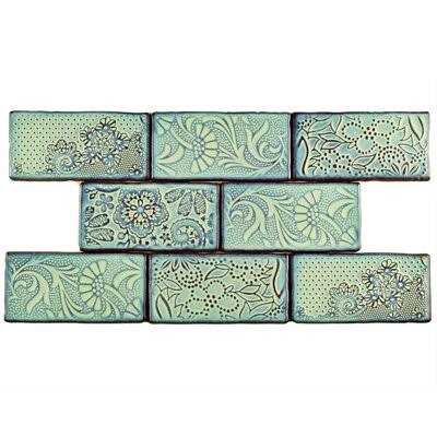 The Antiqua 3″ x 6″ Ceramic Wall Tile in Feelings Agua Marina combines a classic subway format with a fresh new glaze. The mixture of uneven edges and the reactive glaze offers up a remarkable, rustic feel. The embossed floral designs in vibrant mint that gradually darken to teal, navy, and brown around the edges create a vintage look. The Antiqua tiles combine well and are appropriate for use on interior walls.