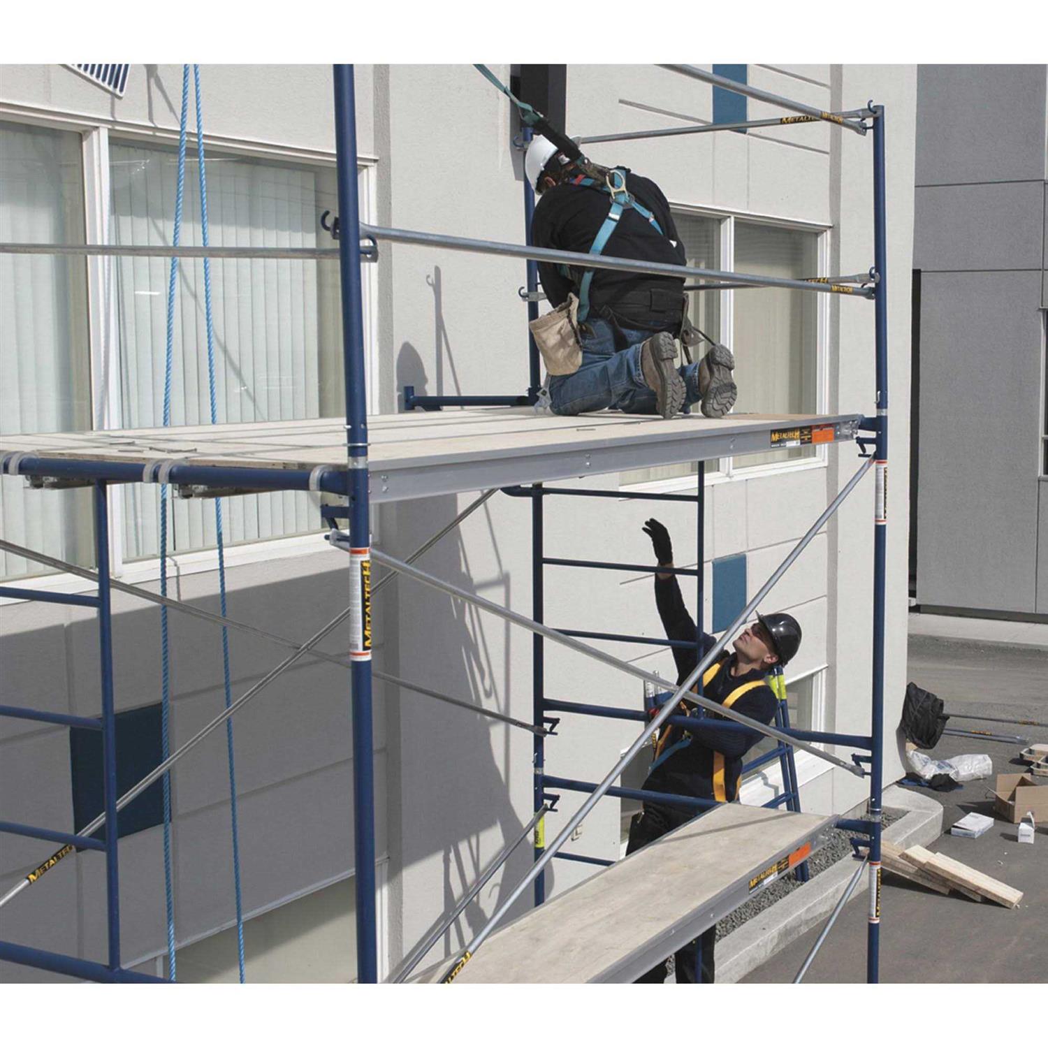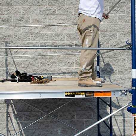 The MetalTech Aluminum Scaffold Platform with Plywood Deck is built with a rugged 5/8 in. thick plywood deck and platform crossbeams to evenly distribute the load. The deck also has an aluminum protective edge with slide locks on each end and is constructed to work with both standard and arched frames. Its sturdy, weather-resistant design meets OSHA requirements and supports up to 75 lbs. per sq. ft. for multiple workers at a time. Galvanized steel crossbeams evenly distribute load Supports multiple workers at once Weather resistant for outdoor use Platform crossbeams are made of galvanized steel with an ergonomic handle cut out for comfort and easy handling 5/8 in. thick plywood provides a firm and stable platform Anti pop-up sliding lock system at each end for added safety and security Load capacity of 75 lbs. per sq. ft. to comfortably support multiple workers Bolt-on assembly for easy replacement Versatile design works with standard or arched frames Meets OSHA standards for jobsite safety Metaltech, Aluminum Scaffold Platform with Plywood Deck, M-MPP719 MetalTech Aluminum Scaffold Platform with Plywood Deck is ideal for working along walls and windows. Installation is easy.