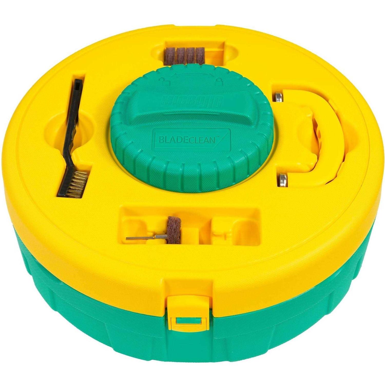 The BLADECLEAN System is an all-in-1 solution designed to clean saw blades and router bits faster and easier than ever before. The included magnetic handle allows you to lift and move blades more safely and the custom designed scouring pad cleans an entire side of a blade in a single motion, all without dangerous chemicals. That means no more tediously brushing individual teeth. Start to finish, users can clean a 7-1/2 in. to 12 in. Dia saw blade in under a minute. A simple solution of water and common household cleaner can be safely stored in the sealed cleaning well for later re-use. The locking lid features an additional well for storing and soaking router bits. Also included are 6 small scouring discs and a custom heavy-duty mandrel specifically designed to clean router bits quickly with a common rotary tool or power drill.