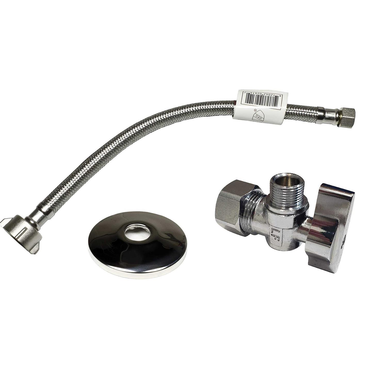 Miiflex Complete Toilet Set Valve 1/2 in. Nom Inlet x 3/8 in. OD Compression Outlet Angle Shut Off + Escutcheon Plate + 12″ Long Stainless Steel