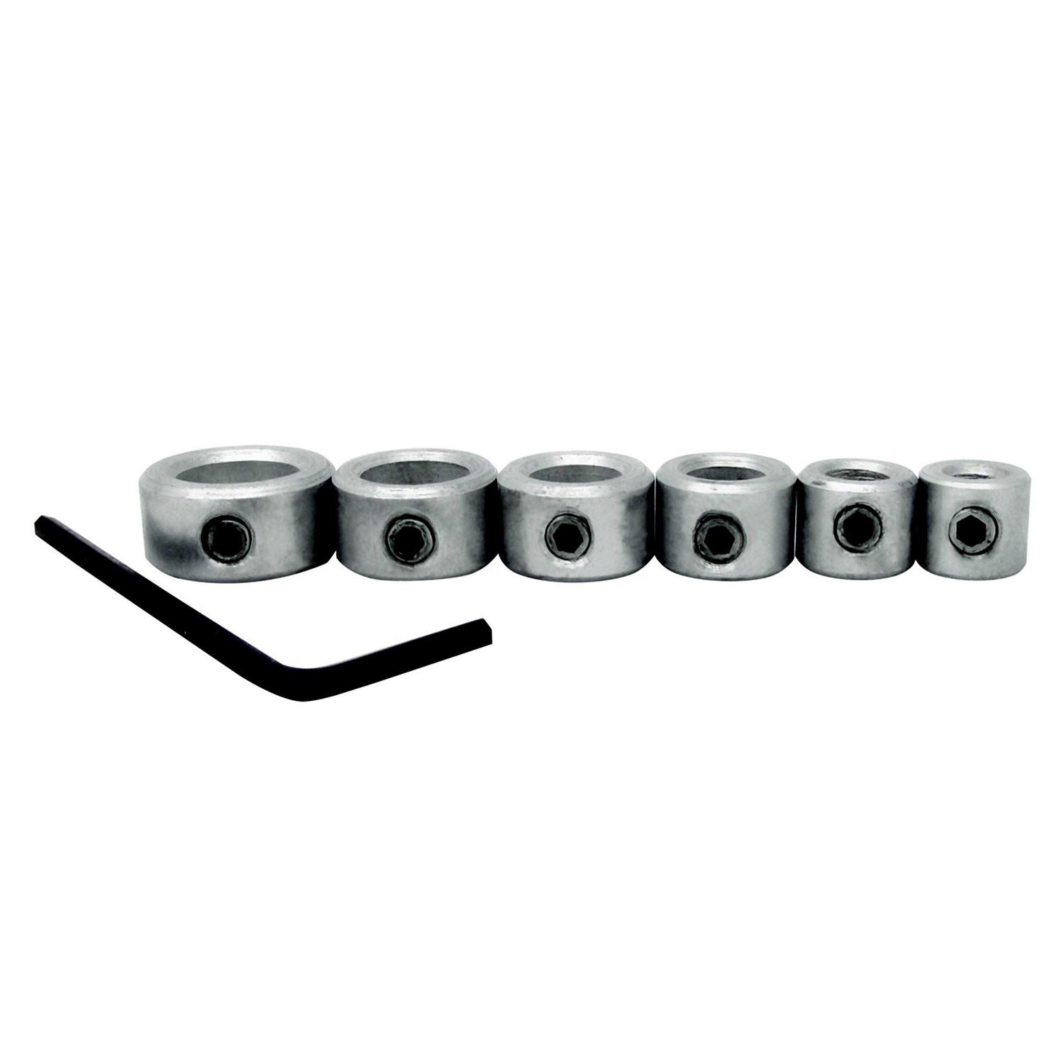- Six collar stops for use on 3/16″, 1/4″, 5/16″, 3/8″, 7/16″, and 1/2″ diameter drill bits