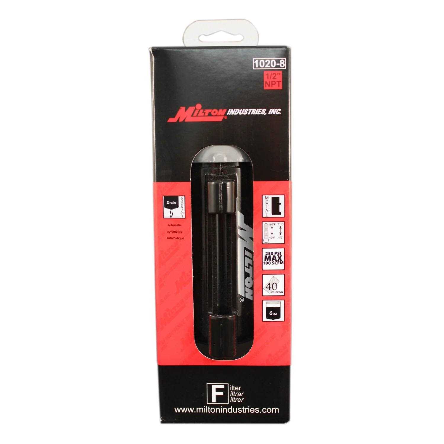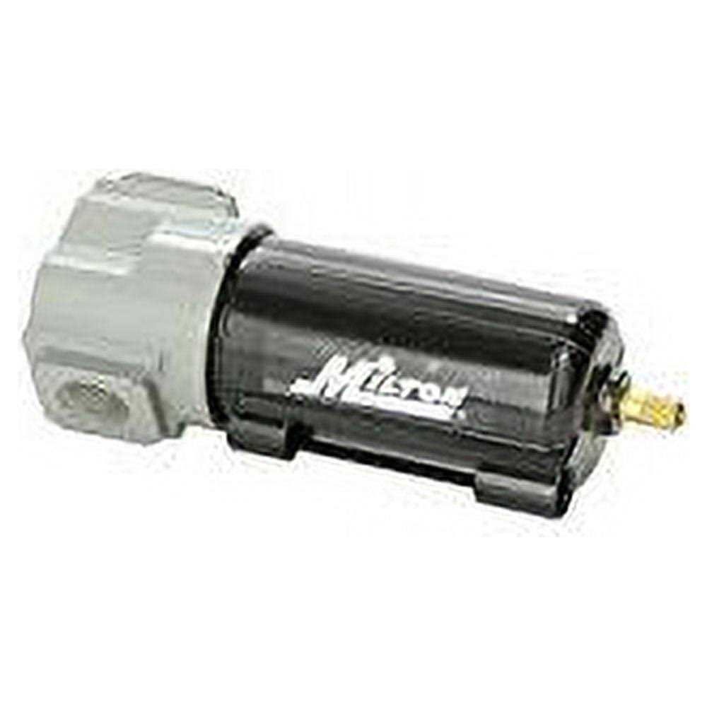 This 1/2′ NPT Milton micro filter is supplied with pre-assembled automatic overnight drain, which will operate when an air supply is shut down or when liquid has gathered in the filter bowl. The included 3 stage baffle system offers exceptional moisture removal. This micro filter includes a porous bronze sintered 40 micron filter element which allows less pressure drops and longer cleaning intervals. Micro filters remove harmful water or oil condensate, pipe scale, dirt and rust from compressed air systems and are used as pre-filters to coalescing type filters to ensure high efficiency and long element life. The corrosion resistant metal bowl has a capacity of 6 ounces. Maximum of 250 PSI and 100 SCFM.