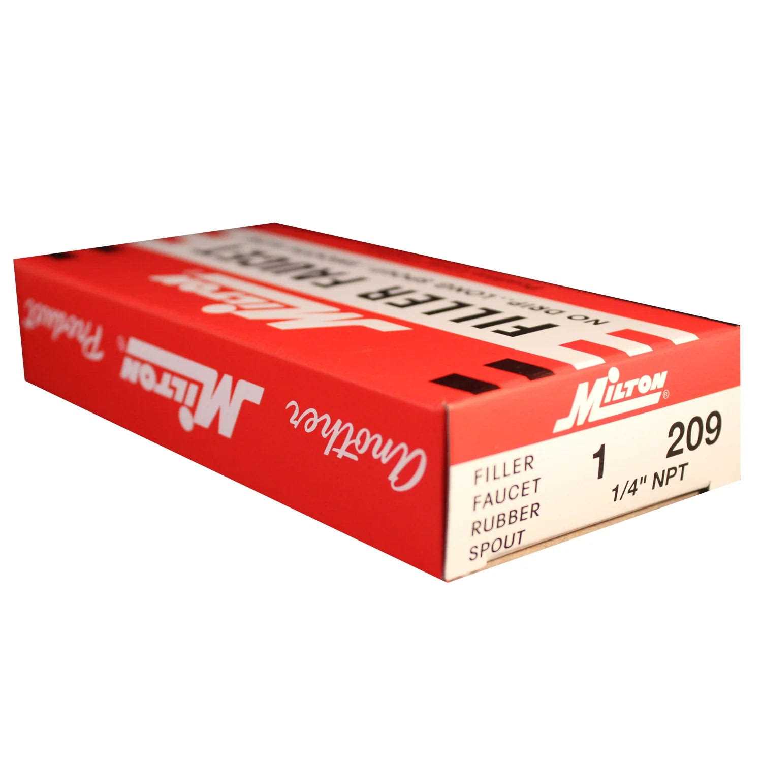 Milton (209) 0.6cm NPT Rubber Filler Spout Faucet This 0.6cm FNPT filler faucet provides easy operation and smooth flow, providing a long spout and lever control. These filler faucets are heavy duty, ruggedly built with stainless steel springs. Made up of a zinc alloy body and a 10cm nitrile rubber filler spout, this faucet offers 30 to 35 PSI.