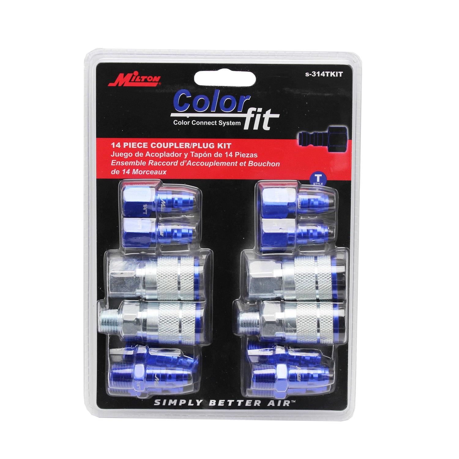 MILTON 14 Piece T Style Air coupler and plug fittings ColorFit set customized a color code system that allows for easy matching of couplers and plugs among the standard Industrial pneumatic air coupler quick connects. Great way to solve that annoying problem of potential crossing contaminating different air lines. By dedicating certain colors to different air lines, this will eliminate the risk of mixing a lubricated line with a dry air line which will help prolong your applications and quickly finishing any project. Each piece coated with Anodized Blue aluminum and heavy duty steel sleeves to prevent scratches or dulling of the coupler and plug after uses.