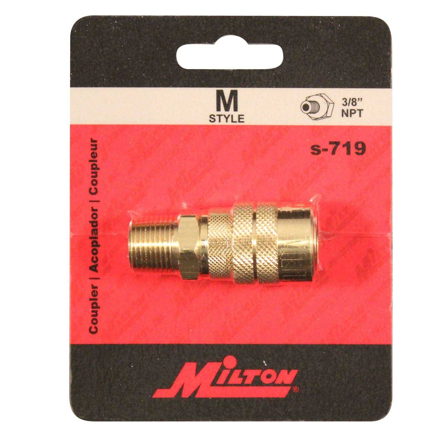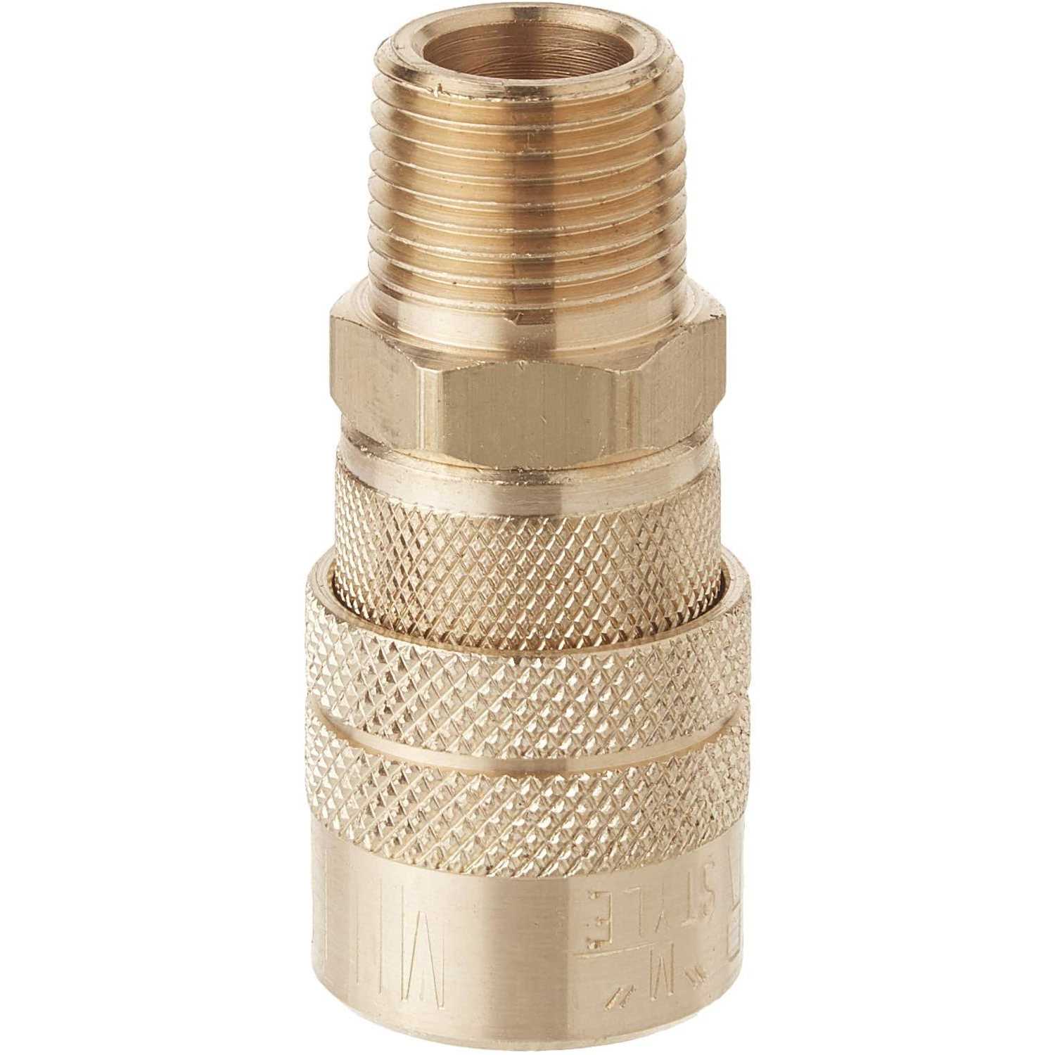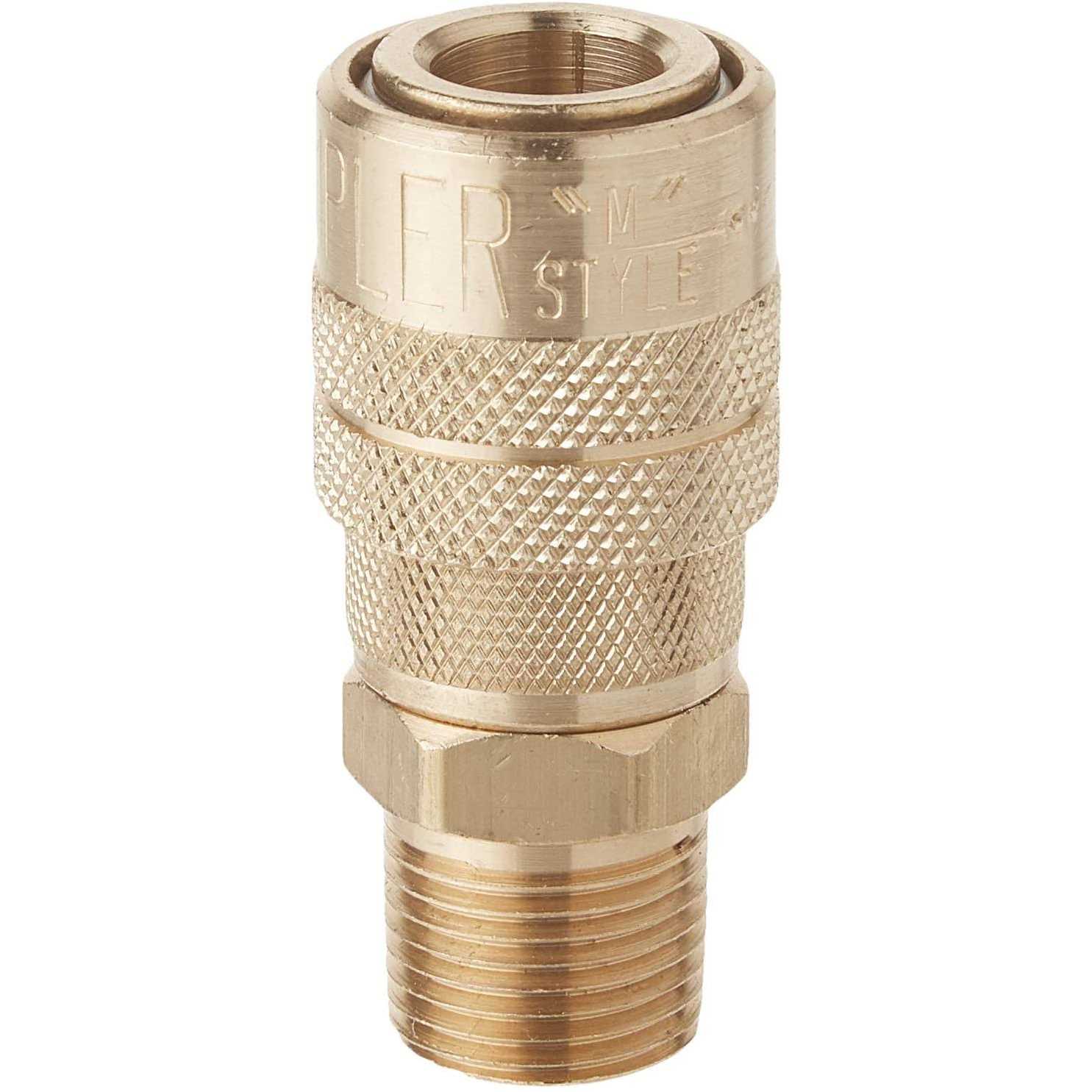Basic 1/4 inch size industrial interchange series M style coupler bodies are brass with brass sleeves. 3/8 inch NPT male thread connection. Maximum inlet pressure of 300 PSI. Maximum working pressure of 250 PSI.
