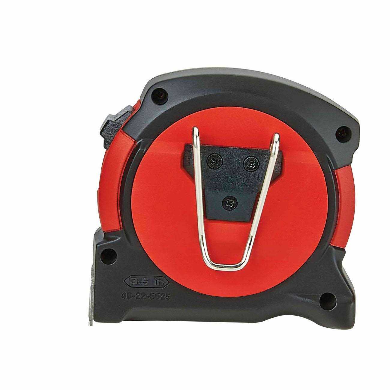 Heavy duty tape measure is manufactured with a five point reinforced frame and Nylon BOND blade protection delivering ten times more resistance to contamination for optimal durability and long lasting use. Features a wide base allowing more stability during layout and wire form belt clip reducing pocket tearing. Contains an optimized hook specifically designed for scoring applications. Product provides up to a 9 standout and measures 25.