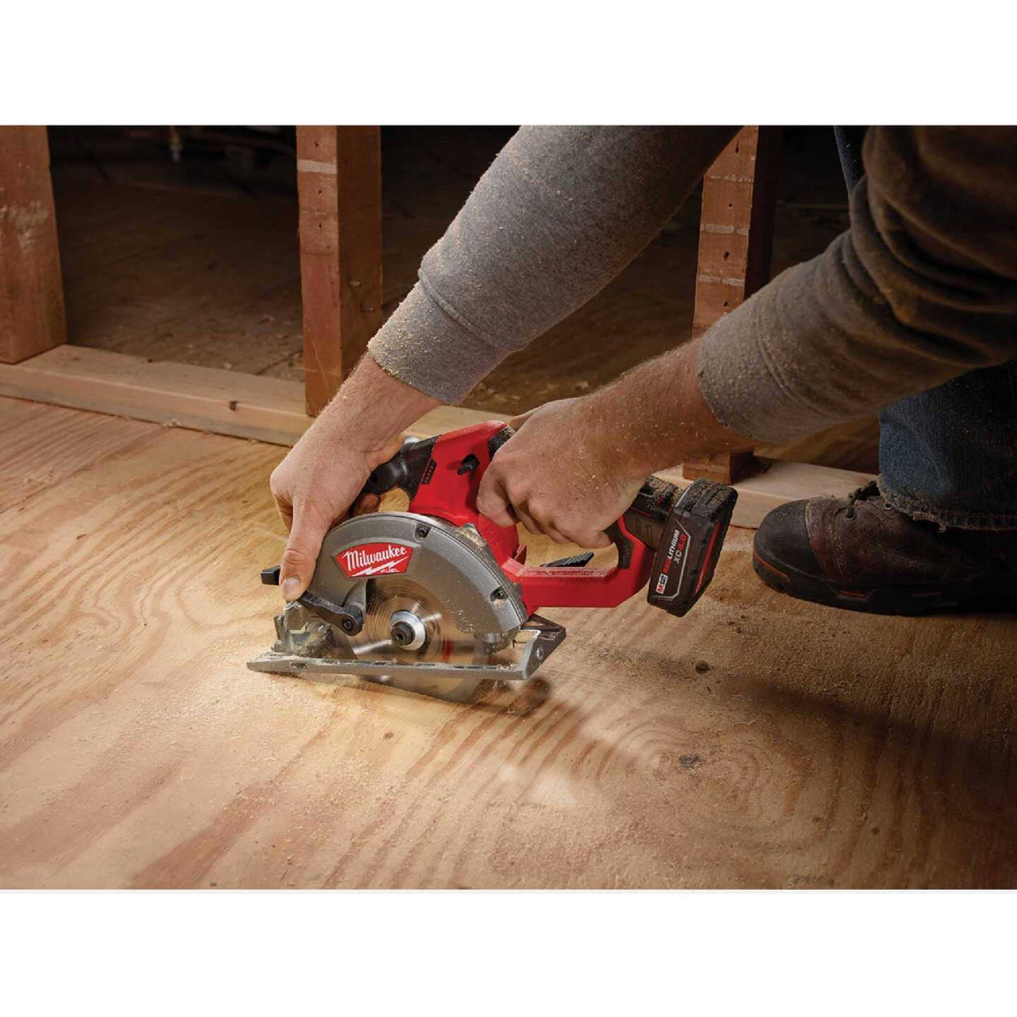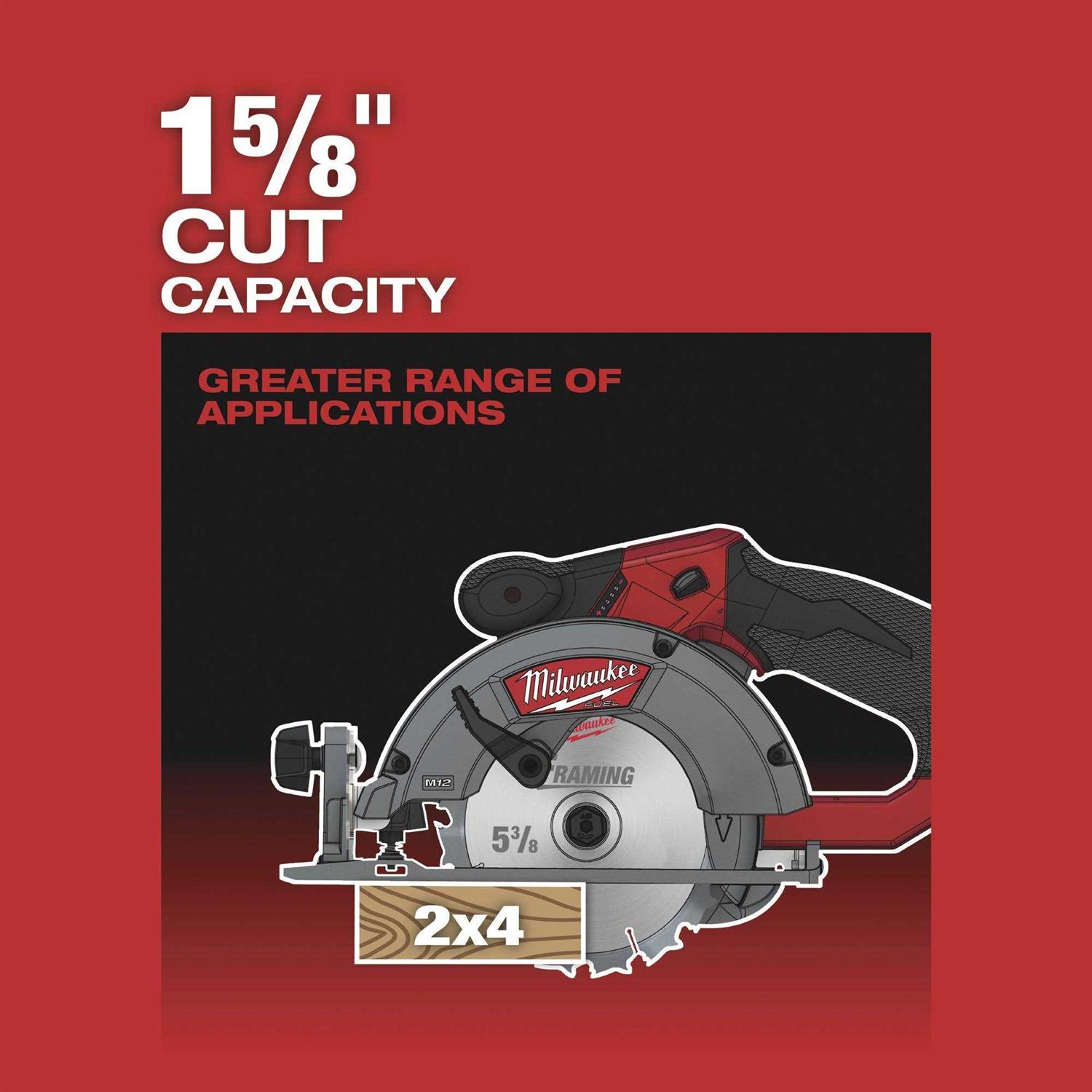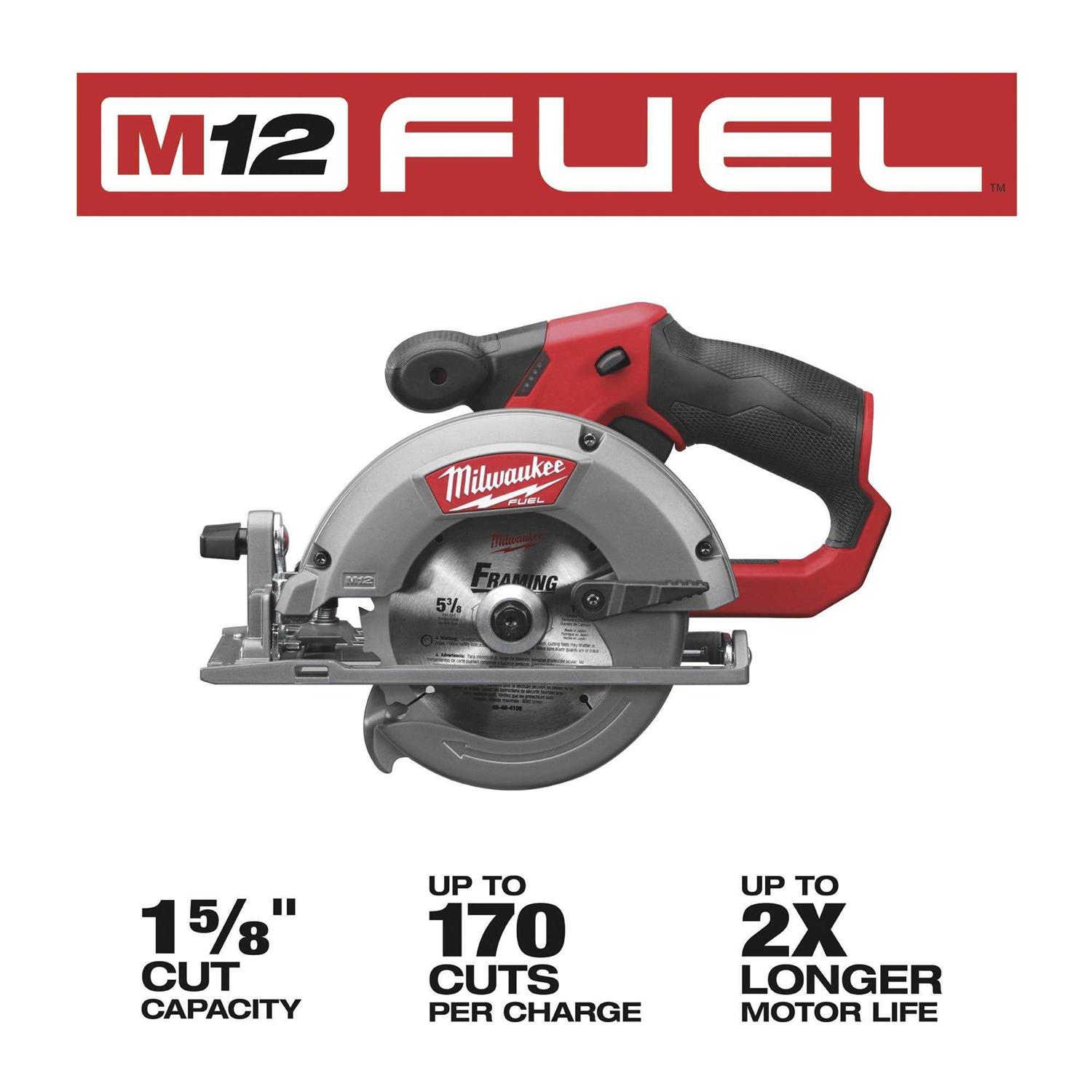 The M12 FUEL brushless circular saw is designed to cut a wide range of common jobsite materials and deliver the power, run-time and durability required by professionals. With a cut capacity of 1-5/8 In. for cutting 2x dimensional lumber, this saw delivers up to 170 cuts per charge and up to 2x the motor life of competitive products. Features a built-in LED (light emitting diode) light for greater cutline visibility in low light situations, and all aluminum guards and shoe for increased durability. POWERSTATE brushless motor delivers maximum power and provides longer motor life. REDLINK PLUS intelligence provides optimized performance and overload protection using total system communication between tool, battery and charger. REDLITHIUM battery pack delivers more run-time, power and longer battery life. Bare tool – battery and charger not included. Voltage:12V, Battery Type:Lithium-Ion, Blade Diameter:5-3/8 In., Arbor Size:10mm, No Load Speed:3600 rpm, Depth of Cut at 90 Deg:1-5/8 In., Depth of Cut at 45 Deg:1-1/8 In., Bevel Capacity:50 Degree, Weight:5.35 Lb., Dimensions:12-3/8 In. L, Batteries Included:No, Charger Included:No, Case Included:No, Warranty:5 Year
