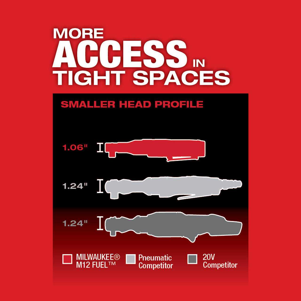 The Milwaukee M12 FUEL 1/2 in. ratchet is the first cordless tool that provides both the torque and compact size to replace pneumatic ratchets in the industry. With up to 60ft-lbs of max torque and 175 RPM, this tool is the ideal fastening solution for automotive mechanics and maintenance and repair professionals who demand maximum performance and convenient portability. A low profile head and cordless design allows for our users to have more access in tight spaces than competitive units. With the industry leading fuel technology, a reinforced mechanism and investment cast steel yoke housing, this ratchet can withstand daily jobsite wear and tear for years of reliable use.