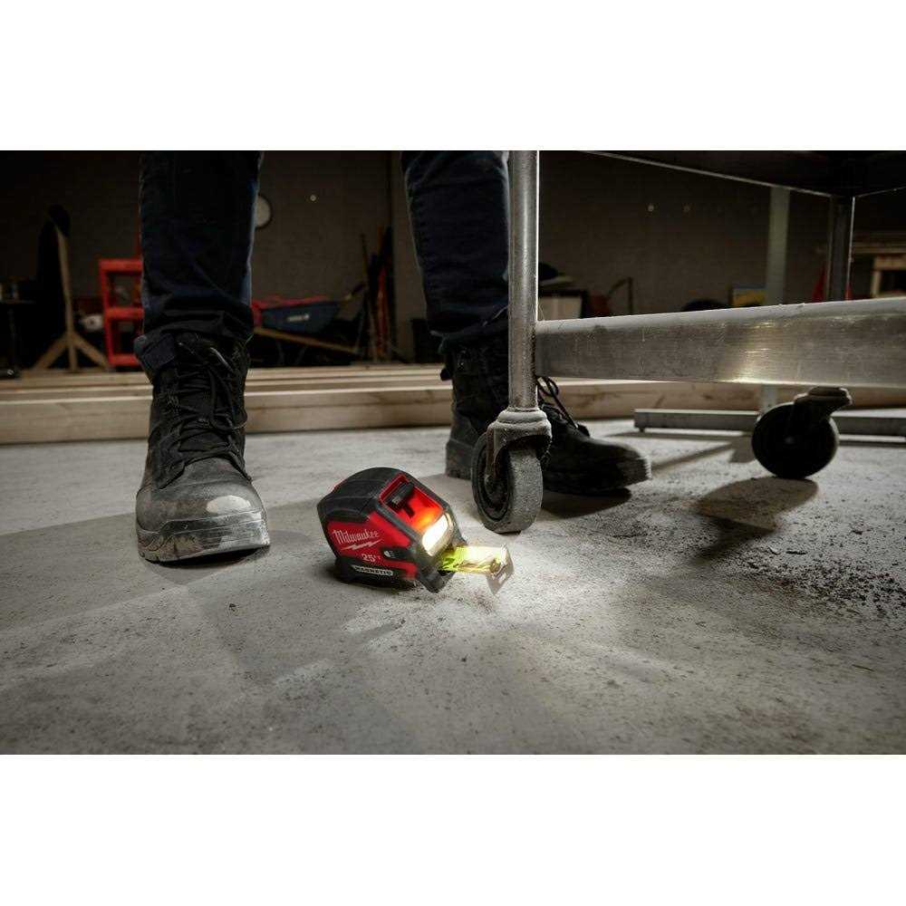 The MILWAUKEE 25ft Compact Wide Blade Magnetic Tape Measure w/ Rechargeable 100L Light provides the brightest and clearest measuring in the industry. The LED on this 25ft tape measure delivers 100 lumens, providing bright and clear lighting for dimly lit job sites. The 15 of reach allows you to take long measurements on your own and reach further on the job site. Featuring an impact-resistant lens & frame, and an IP54-rated lens, our LED Tape Measure is constructed to withstand harsh job site conditions. This tape is wear-resistant with nylon blade protection, and an additional anti-tear coating on the first 6 of the blade reduces tape tear. The finger-stop technology provides greater control of your measurements. This LED Tape is USB rechargeable and delivers up to 2.5 hours of continuous runtime.