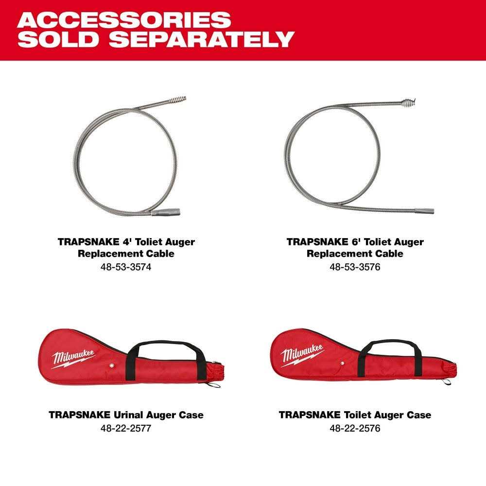 The MILWAUKEE M12 TRAPSNAKE 2-Tool Combo Kit Porcelain Auger System is the ideal solution for service plumbers and maintenance crews to unclog urinals, toilets, and floor traps. By offering multiple auger attachments that are compatible with a single power source, the TRAPSNAKE Auger System delivers versatility and capabilities never seen before in a closet auger. The auger system is powered by a Milwaukee M12 TRAPSNAKE Driver and is the first powered unit optimized for the challenges of porcelain fixtures. It has power and speed to work through tough clogs in tight traps with optimized electronics that protect the fixture from the auger and allow users to feel when engaged with a blockage to aid in retrieving. TRAPSNAKE Auger attachments feature several industry-firsts, including a fixed rubber boot for maximum porcelain protection, an integrated locking mechanism that holds the cable in place for easy telescoping extension, and replaceable cables to maximize the longevity of the tool. This combo kit includes an M12 TRAPSNAKE 4′ Urinal Auger, M12 TRAPSNAKE 6′ Toilet Auger, M12 REDLITHIUM CP 1.5 Battery Pack, M12 Battery Charger, and M12 TRAPSNAKE Driver.