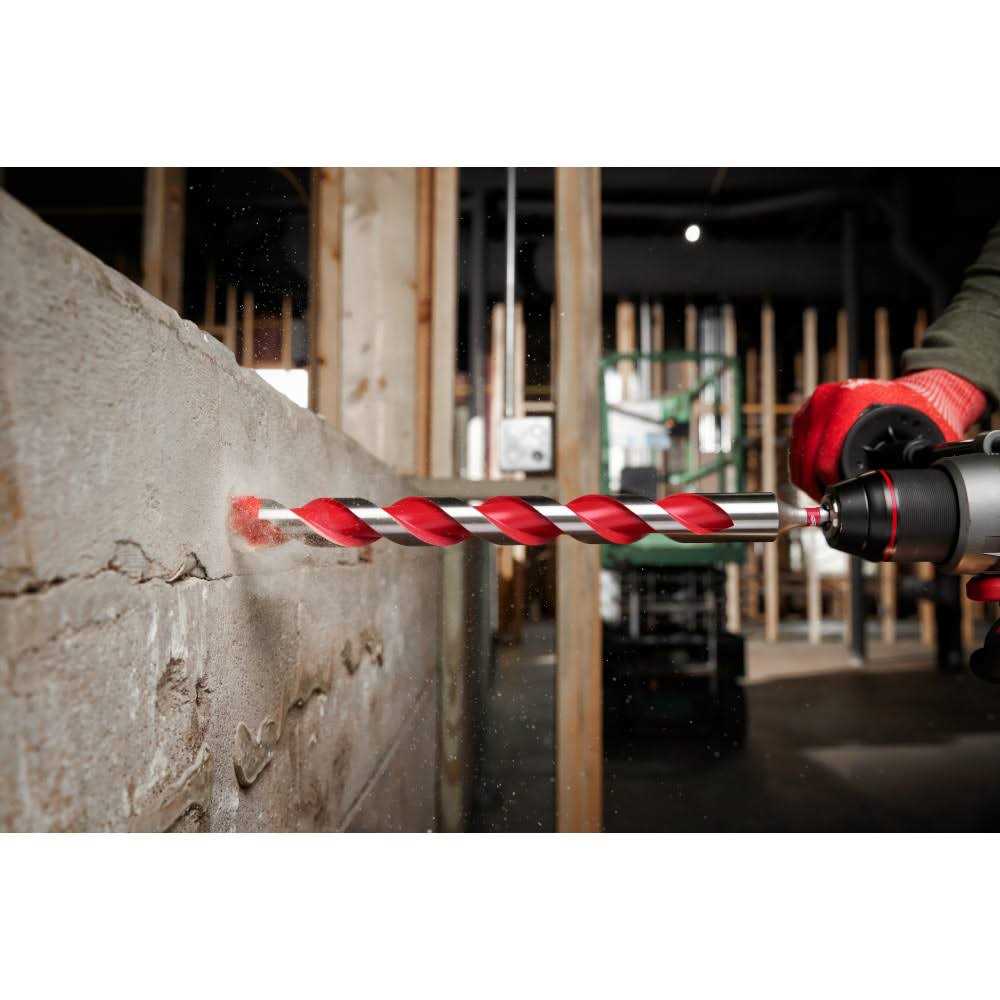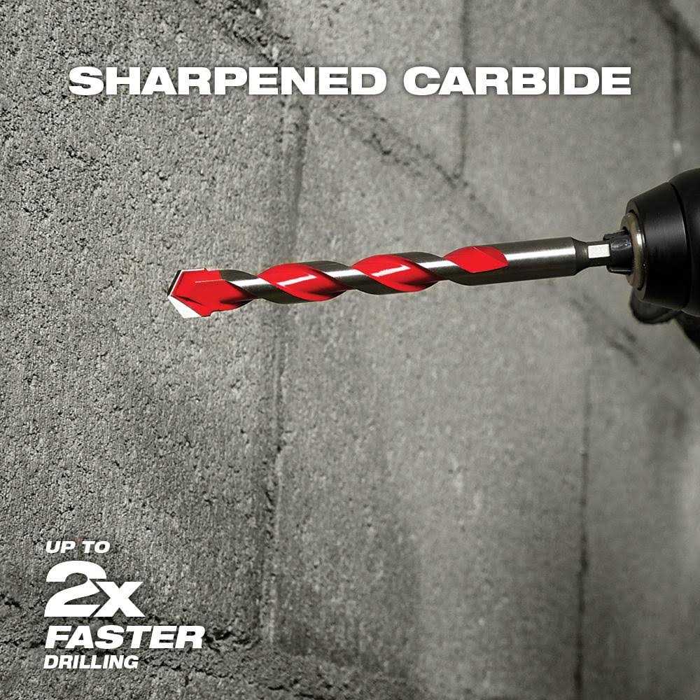 The MILWAUKEE 1″ x 10″ x 12″ Carbide Hammer Drill Bit uses sharpened carbide to deliver up to 5x longer life in concrete and up to 2x faster drilling into masonry material. Engineered with a precision ground tip, these Milwaukee drill bits deliver faster starts and less walking in concrete, brick, and block. The wide flute design removes dust faster, reducing heat and delivering more holes per charge. These bits feature a 3-flat shank for better grip and control. The extended life of the Milwaukee Carbide Hammer Drill Bits provides the ideal solution for drilling in masonry materials with cordless and corded hammer drill/drivers.