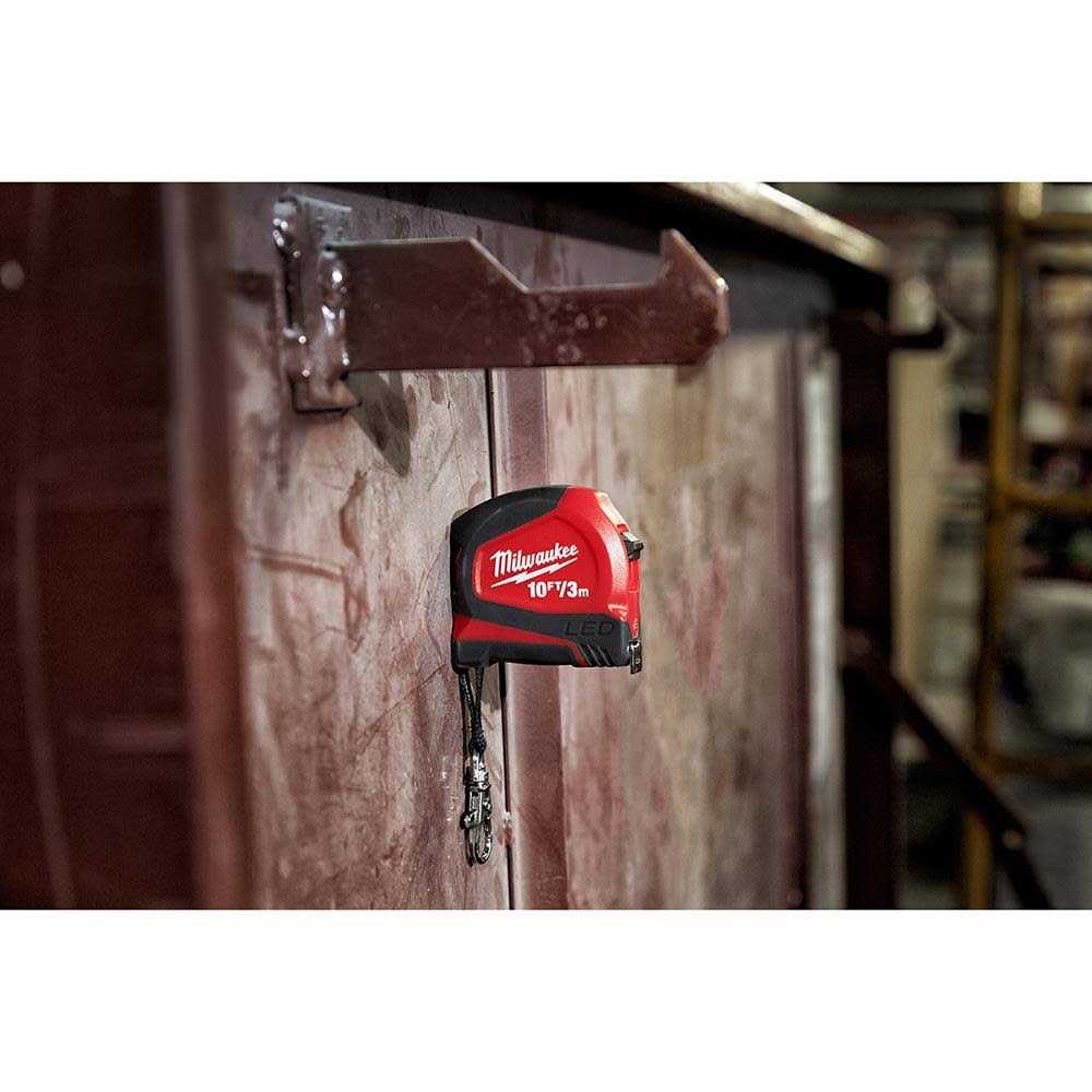 Milwaukee 48-22-6601 Keychain Tape with LED 10FT/3mOur 10ft/3m Keychain Tape Measure with LED features an LED Light to help users more easily read measurements in low light conditions. A 4-point reinforced frame protects against damage from dropping. For added functionality the tape measure is equipped with a magnetic back for storage. A secure, heavy duty keychain clip gives it the versatility to clip onto almost anything from belts to key rings.