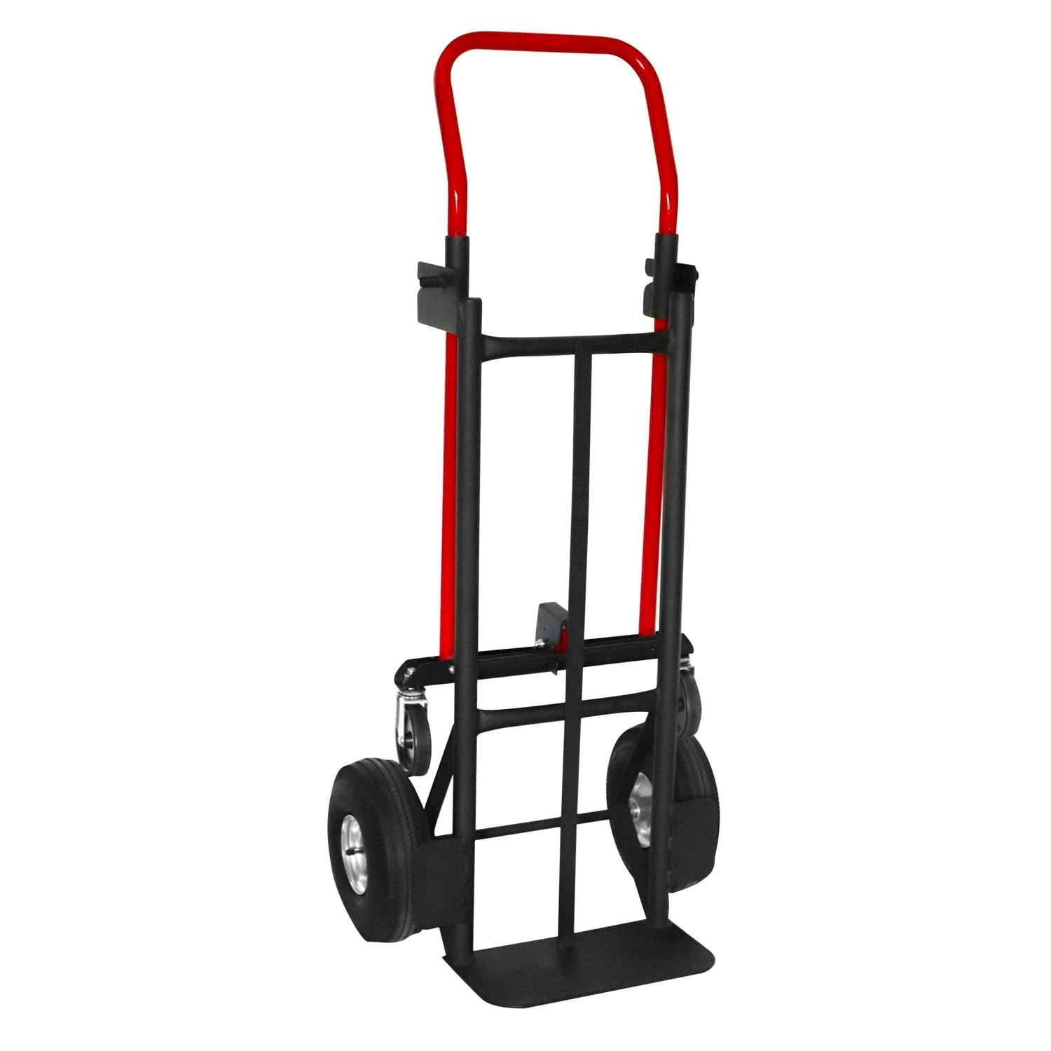 Easily converts from vertical 2-wheel truck to 4-wheel platform position by pressing down with your foot on the handle release mechanism. 10-In pneumatic tires help cushion the load over rough terrain. Wheel guards protect the load from the tires. Convertible position allows for use on a variety of loads.