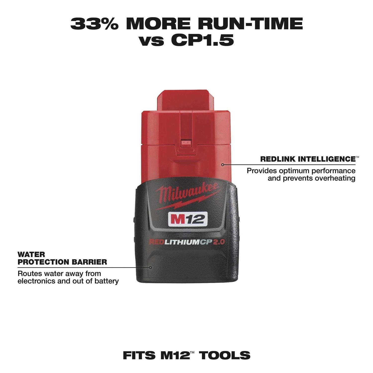 Delivers up to 2X more runtime, 20% more power and 2X more recharges than standard Lithium-Ion batteries. The M12 REDLITHIUM 2 compact battery pack features great pack construction, electronics and performance to deliver more work per charge and more work over pack life than any battery on the market. It offers 2 Ah of runtime. With Milwaukee durability built into each pack, this battery runs cooler and performs in climates below 0 deg F/-18 deg C. Its compact design fits in tight work spaces and reduces user fatigue. Managed by Milwaukee’s exclusive REDLINK intelligence, the battery features overload protection to prevent you from damaging your cordless power tools in heavy-duty situations, while the discharge protection prevents cell damage. The temperature management system and individual cell monitoring help maximize battery life. Switch to the REDLITHIUM 2 compact battery pack to instantly upgrade the runtime and durability of your Milwaukee M12 cordless tools.
