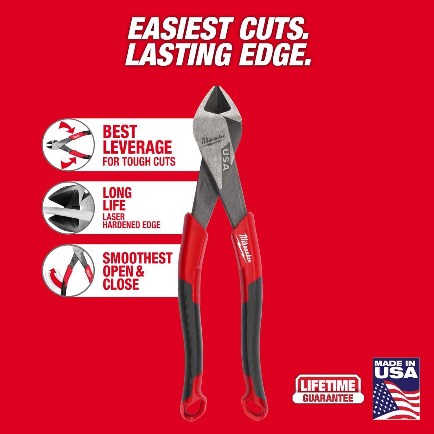 Our Milwaukee Diagonal Cutting Pliers deliver the easiest cuts and a lasting edge for the professional user. Our pliers are designed with an optimized pivot point to provide the best leverage for tough cuts through materials like wires screws and other common hardware. Our diagonal cutting pliers deliver the confidence of a long cut life with a laser-hardened edge. Our diagonal cutting pliers are engineered to deliver the smoothest open and close experience from the start with no break-in period required. The pliers are tether ready and offered in both dipped grips with a split-ring hole. Our Diagonal Cutting Pliers are available in sizes 6-inch 7-inch and 8-inch.