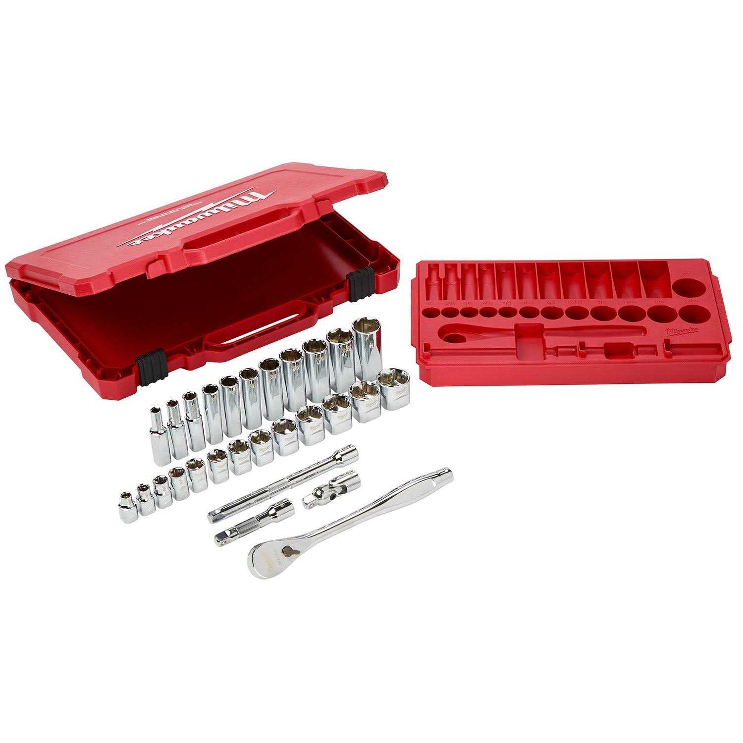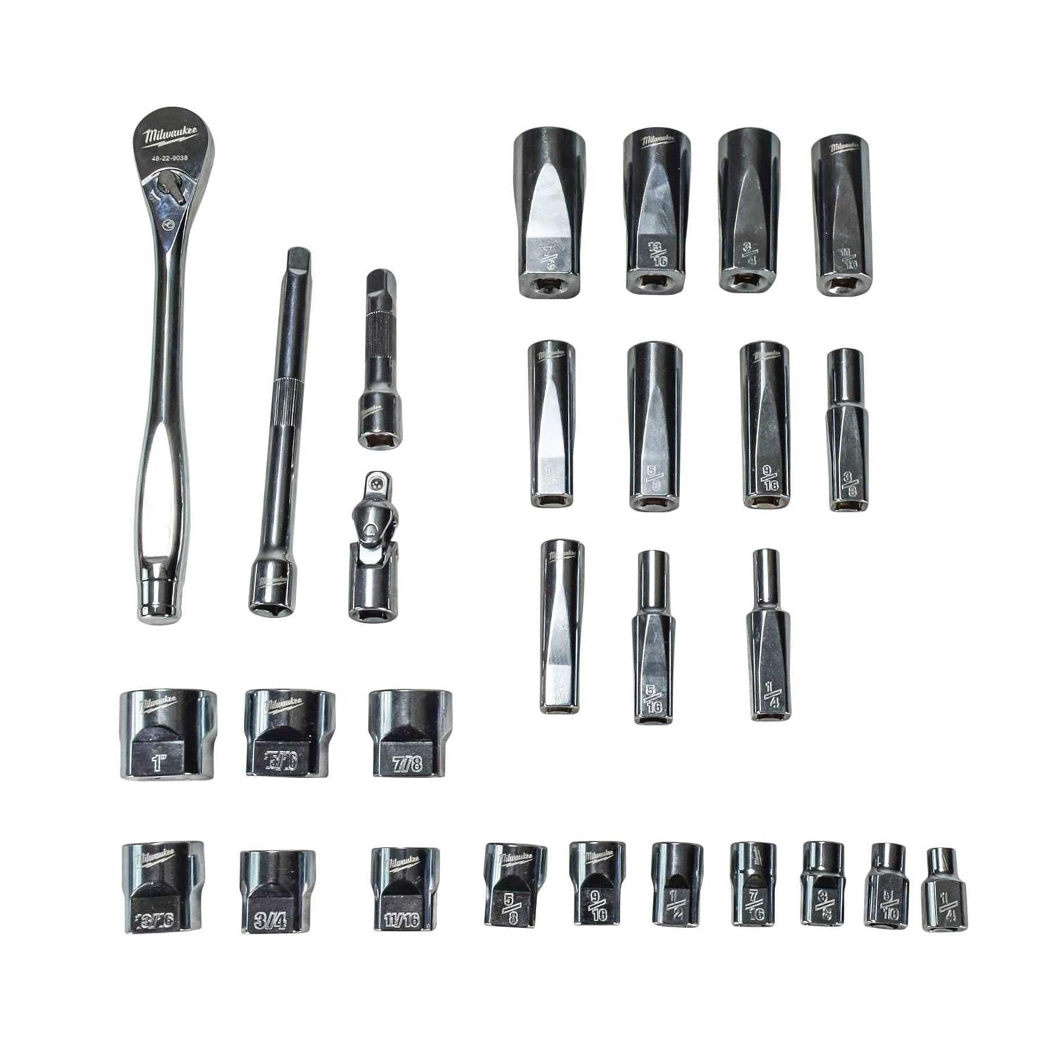Our MILWAUKEE SAE 28 piece 3/8″ drive Ratchet & Socket set is designed from the ground up, offering our users the Most Versatile Sockets that are Anti-Roll and Wrench-Ready. Its innovative FOUR FLAT Sides feature an anti-roll and wrench-ready design. The 90 tooth ratchet tool offers 4? of arc swing and a slim profile design, allowing you to work in tighter and more confined spaces, be it under the hood of a car or in the middle of a remodel. The ratchet and socket kit comes with a removable inner tray which is perfectly designed to be stored long-term in a steel storage chest. All of our sockets are stamped with SAE measurements on the flat side for easy-to-read visibility. It also comes with a durable carrying case for ultimate portability. The set comes with accessories included so that our users can get every job done, both in the garage and on the jobsite. Our ratchet and socket set is backed by our Lifetime Guarantee.