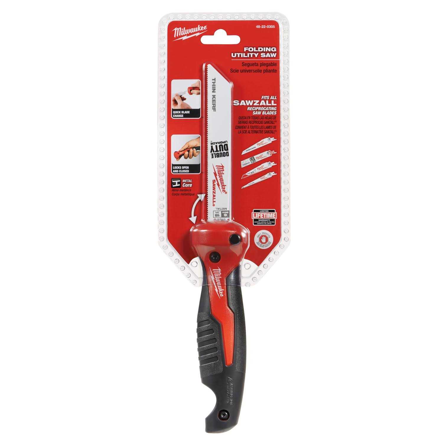 6″ blade. Offers a tool free blade change up to 5 times faster to avoid downtime in the field. Blade folds into the handle for easy storage. Complete with rubber over mold to increase comfort and reduce hand slippage. Includes 8/12, 18, & 24 TPI Sawzall blades. Length: 11.5″.