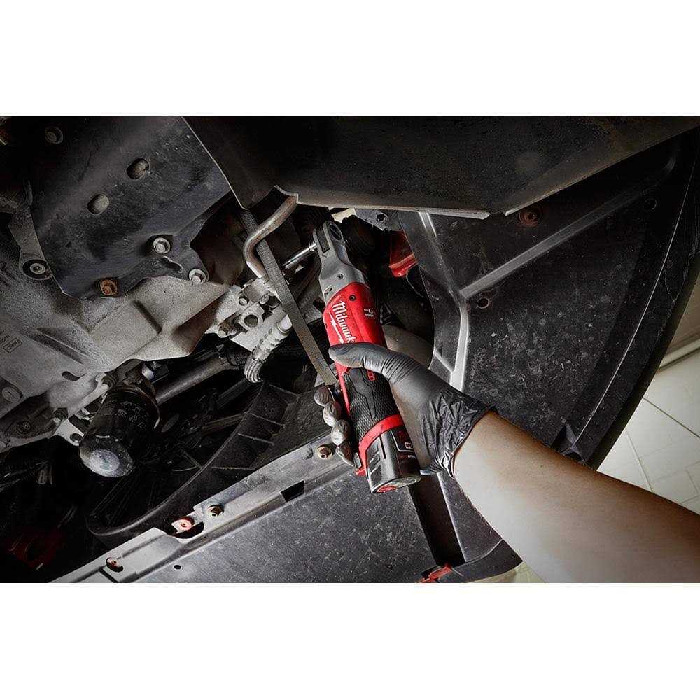 M12 Cordless 3/8″ Lithium-Ion Ratchet Kit Choose the sub-compact ratchet with best-in-class power, speed and durability. The M12 Cordless 3/8” Lithium-Ion Ratchet is the ideal tool for auto mechanics, maintenance and repair professionals looking for maximum performance and productivity in a subcompact cordless tool. It utilizes a powerful 12-volt motor to produce up to 35 ft-lbs of torque and 250 RPM, giving users the power and speed of a pneumatic ratchet without the airhose. It’s powered by the M12 REDLITHIUM Battery Pack, which delivers more work per charge and more work over pack life than the competitors, as well as best-in-class performance in extreme jobsite conditions. At just 10-3/4” long and 1.9 lbs, the ratchet is tool-belt portable, and features a 3/4″ low-profile head design for work in the tightest of spaces and engine bays. The variable-speed metal trigger and reinforced steel housing provide maximum control and durability with any application. The kit includes one M12 battery, a 30-minute charger, a 3/8” to 1/4″ adapter and carrying case.