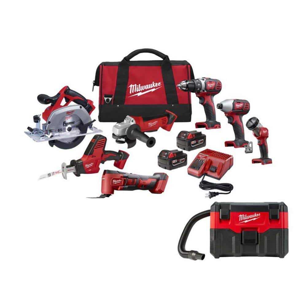 Milwaukee M18 18-Volt Lithium-Ion Cordless Tool Combo Kit with Two 3.0 Ah Batteries, Charger, Tool Bag and M18 2 Gal. Wet/Dry Vac