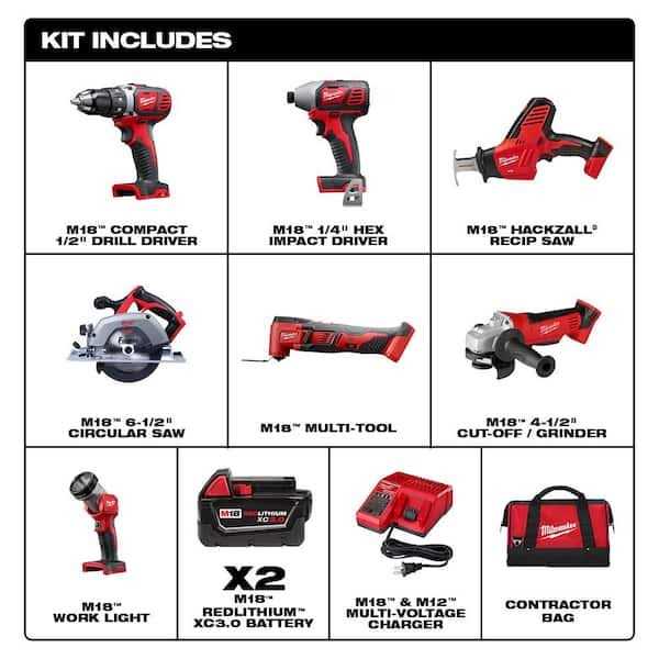 The MILWAUKEE M18 7 Piece Combo Kit features an M18 ” Drill Driver, the most compact in its class to access the tightest work spaces while delivering users 500 in-lbs of torque and up to 1,800 RPM. The M18 ” Hex Impact Driver offers the best power to size ratio among like competitors with up to 2,750 RPM, 3,450 IPM and 1,500 in-lbs of fastening torque for class-leading performance. The M18 6-?” Circular Saw has a 3,500 RPM motor that easily and quickly cuts tough material such as LVL headers. The M18 HACKZALL features a one-handed design for superior control and versatility with the ability to perform fast cuts through a wide range of material such as wood, metal and PVC. The M18 4-?” Grinder is the only cordless option on the market that has the user-preferred paddle switch for comfortable operating in various positions. The M18 Multi-Tool cuts up 50% faster and delivers up to 2X more cuts per charge than the competitors. The M18 LED Worklight has a 35° rotating head to easily direct the 100 Lumens of TRUEVIEW High Definition Output to the desired work area. The two included M18 XC 3.0 Batteries deliver more runtime, power and speed to the power tools and worklight in this kit. Wet/Dry Vacuum provides users with a Powerful and Portable Wet/Dry Clean-up tool. Comes with a flexible hose, crevice tool, utility nozzle and a certified HEPA filter.